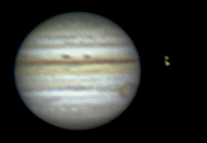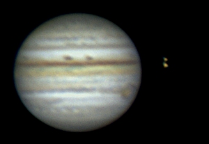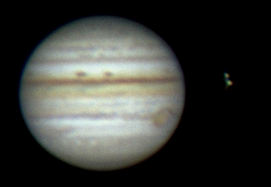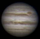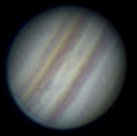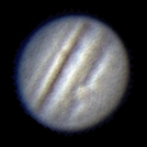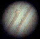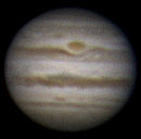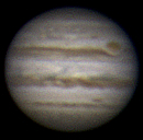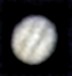 Ich habe nun mehrere Aufnahmen in etwa drei Stunden gemacht und sie zu einem kleinen Film zusammengestellt. Dies war mein erster Versuch einer Jupiteranimation. Die ersten Aufnahmen entstanden bei noch stärkerem Seeing nach diesem heißen Tag. Trotzdem ist die Rotation des Jupiter erkennbar. Okularprojektion auf ToUCam Pro II mit 250/1016mm Reflektor |