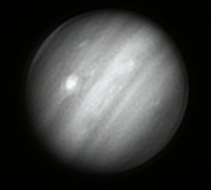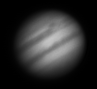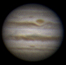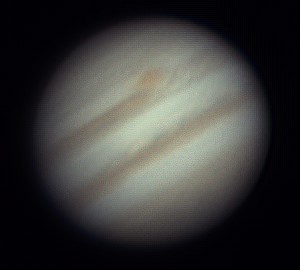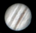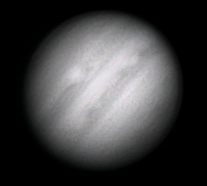 Durch die Addition von 1000 Bildern sind aber dennoch einige Einzelheiten sichtbar. Das südliche Äquatorband ist zurzeit verblasst und der große rote Fleck befindet sich gerade auf der Rückseite des Planeten.
