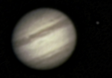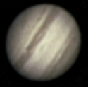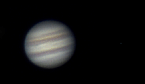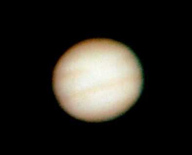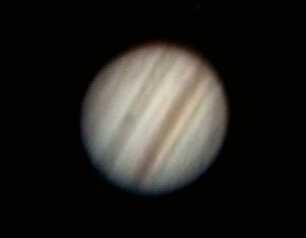 Betrachtet man den Jupiter durch ein Fernrohr, kann man viele Strukturen in der dichten Wolkendecke erkennen. Die streifenförmigen Wolkenbänder und die abgeplattete Form des Jupiter sind auf dieser Aufnahme schwach zu erkennen.