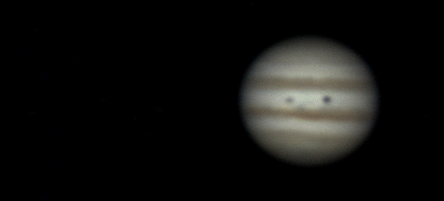 Die Gelegenheit einer klaren Nacht und die Jupiteropposition ließen mich diesen Planeten erneut ins Visier nehmen. Leider entpuppten sich die Bedingungen als doch nicht so gut. Ein klarer Himmel allein genügt nicht. Leichte Windböen erschütterten das Teleskop und starkes Seeing verschleierte die Details. Das Seeing verbesserte sich mit der Zeit langsam. Insgesamt über 5 Stunden lang verfolgte ich Jupiter. Alle 15 Minuten machte ich wieder mehr als 2000 Aufnahmen. So kamen am Ende rund 50000 Aufnahmen zusammen, aus denen 24 Summenbilder entstanden, die ich rechts in der Animation verwendete. Ich nutzte 2 2-fach Barlowlinsen, um 4m |