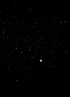 Jupiter ist in seiner Oppositionsstellung deutlich weiter von der Erde entfernt als der Mars. Da er aber der größte Planet in unserem Sonnensystem ist, kann man ihn besser beobachten. Die Umlaufzeit von Jupiter um die Sonne beträgt fast 12 Jahre. Aus diesem Grund hängt seine Sichtbarkeit hauptsächlich von der Umlaufzeit der Erde ab. Er ist damit jedes Jahr mehrere Monate gut zu beobachten. Während der Opposition erreicht sein scheinbarer Durchmesser mehr als 45''. Zu dieser Zeit ist der Jupiter nach der Venus das hellste Objekt am Himmel und leicht zu finden. Auf diesem Bild befand sich der Jupiter im Sternbild Schütze. Links von ihm ist ein Teil des Sternbildes zu erkennen. Der südliche Teil des Sternbildes ist hier nicht zu sehen, da sich der Jupiter nur knapp über den Bäumen befindet. Das Bild habe ich mit einem Kleinbildfotoapparat eine Minute auf 400 ASA Negativfilm belichtet. Die Belichtungszeit kann auch kürzer sein, nur erscheinen dann weniger Sterne auf dem Foto. Außer dem Fotoapparat benötigt man noch einen Drahtauslöser um den Kameraverschluß während der Belichtung festzustellen. Vorher muss der Fotoapparat auf einer "wackelfreien" Unterlage oder mit einem Stativ aufgestellt werden. Bei Belichtungszeiten über etwa eine halbe Minute erscheinen die Sterne dann allerdings als Striche, da sich die Erde dreht. Um das zu vermeiden muss die Aufnahme nachgeführt werden. Dazu ist dann aber ein Fernrohr und eine parallaktische Montierung nötig. Jupiter, Juli 1996 |