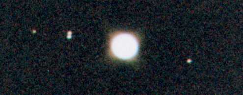 Bessere Ergebnisse konnte ich inzwischen mit dem 250 mm SN - Teleskop erreichen. Bei etwa gleicher Brennweite sind die Monde etwas schärfer. Auch hier habe ich sehr viele Einzelbilder der Hi8 - Kamera addiert. (links) |