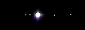 Auch die Jupitermonde kann man mit der Videokamera aufnehmen (linkes Bild). Allerdings muß die Helligkeit der Kamera dabei hochgeregelt werden. Dabei wird natürlich der Jupiter selbst stark überbelichtet. Weiterhin habe ich den Kontrast des Komposits verstärkt, um die Monde deutlicher sichtbar zu machen.