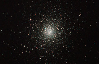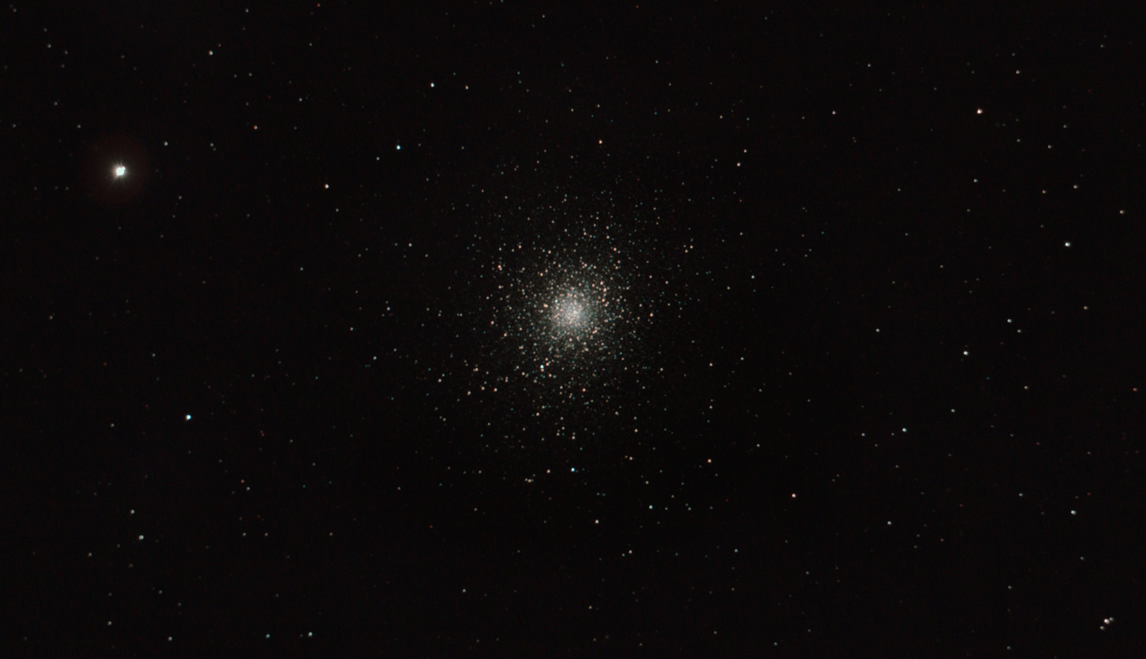 am 21.4.2023 Komposit aus 100 Einzelbildern je 105s - 150s; Canon EOS 1100Da mit CLS-Filter, belichtet im Primärfokus des 250/1016 N Sternbild Herkules 14' 6,5m 26 000 ly Kugelsternhaufen |