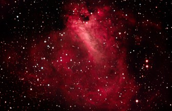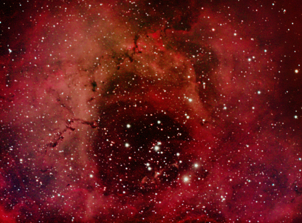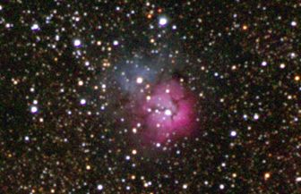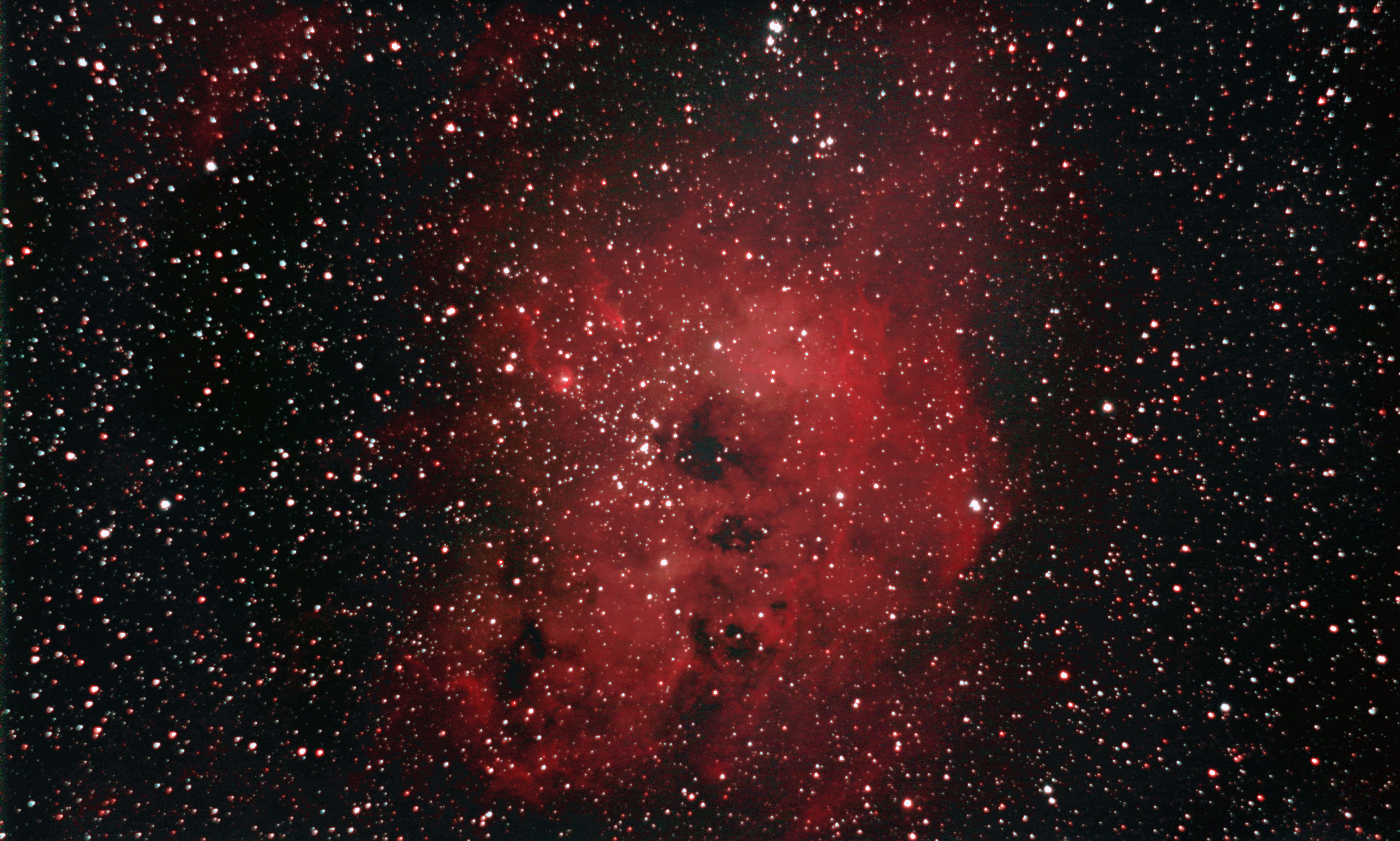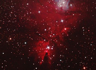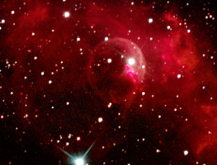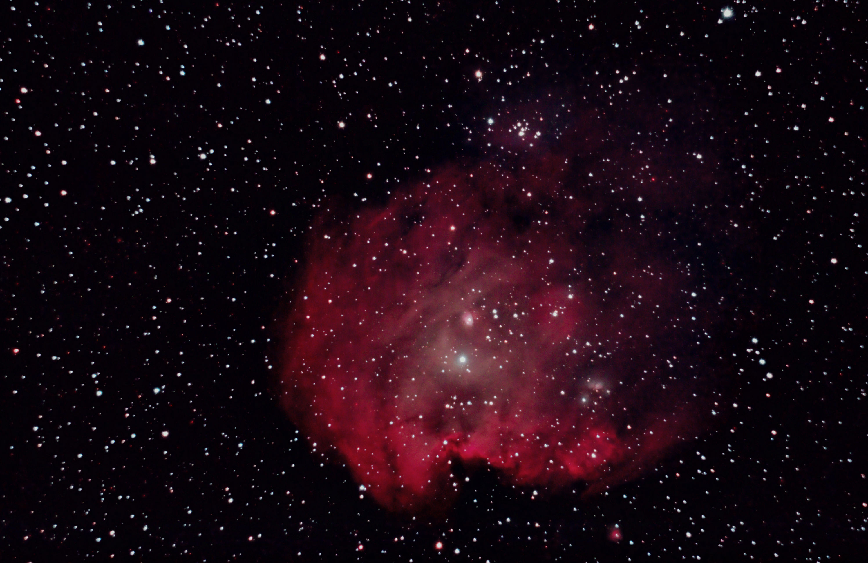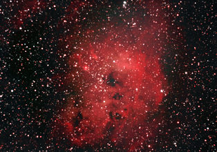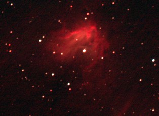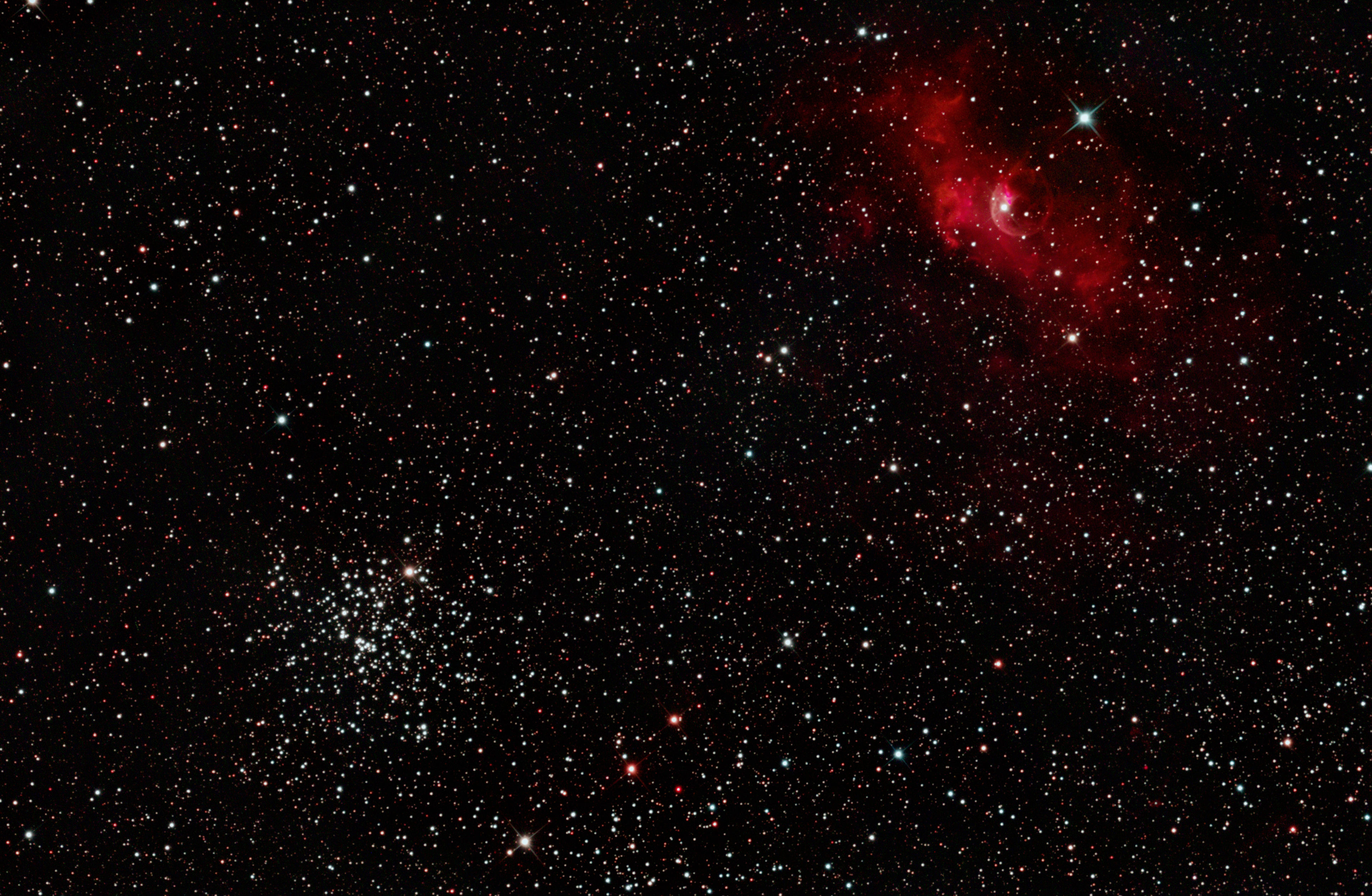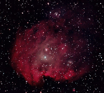 am 12.10.2015, 55 Aufnahmen je 165s durch das 250/1016 N im Primärfokus mit Canon EOS 1100Da bei 800 ASA, CLS Filter, addiert mit Fitswork Sternbild Kassiopeia 15' 7100 ly Emissionsnebel, HII-Region, Blase durch Wolf-Rayet-Stern erzeugt; rechts unten in der Aufnahme: offener Sternhaufen M 52 |