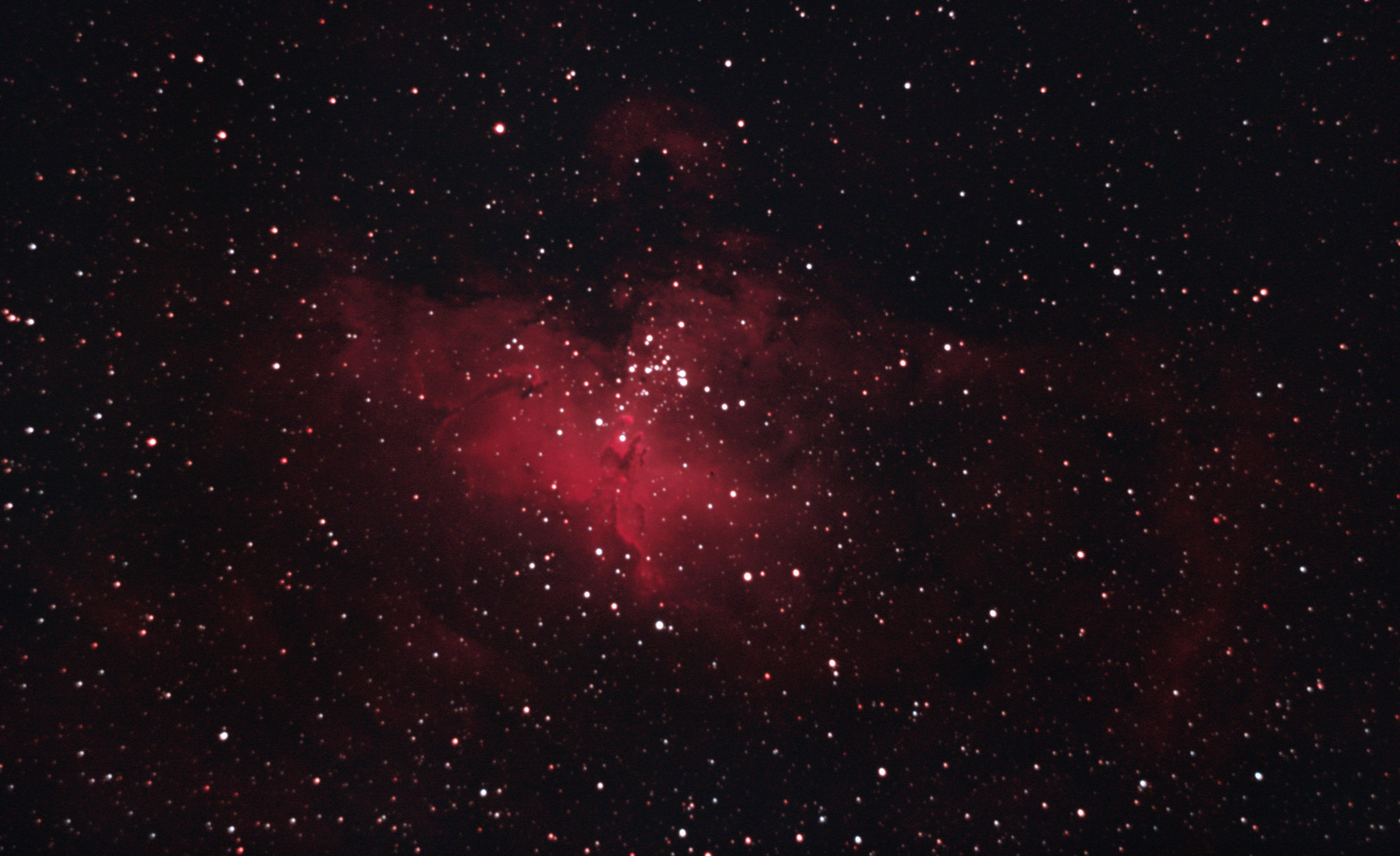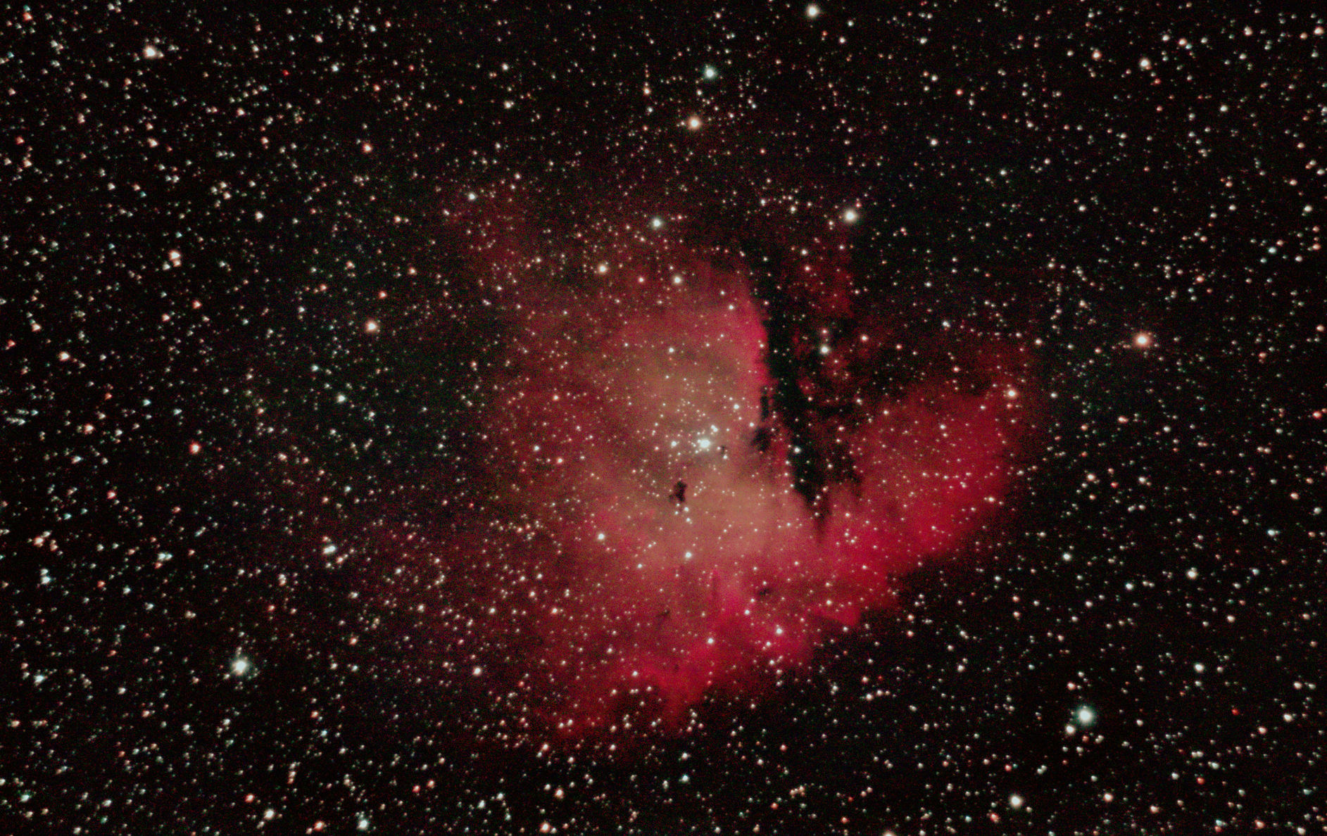 am 18.4.2020; 67 Aufnahmen mit je 85s bei 1600 ASA durch das 250/1016 N im Primärfokus auf Canon EOS 1100D mit CLS-Filter Sternbild Schwan 10' 6,6m 4000 ly Offener Sternhaufen |