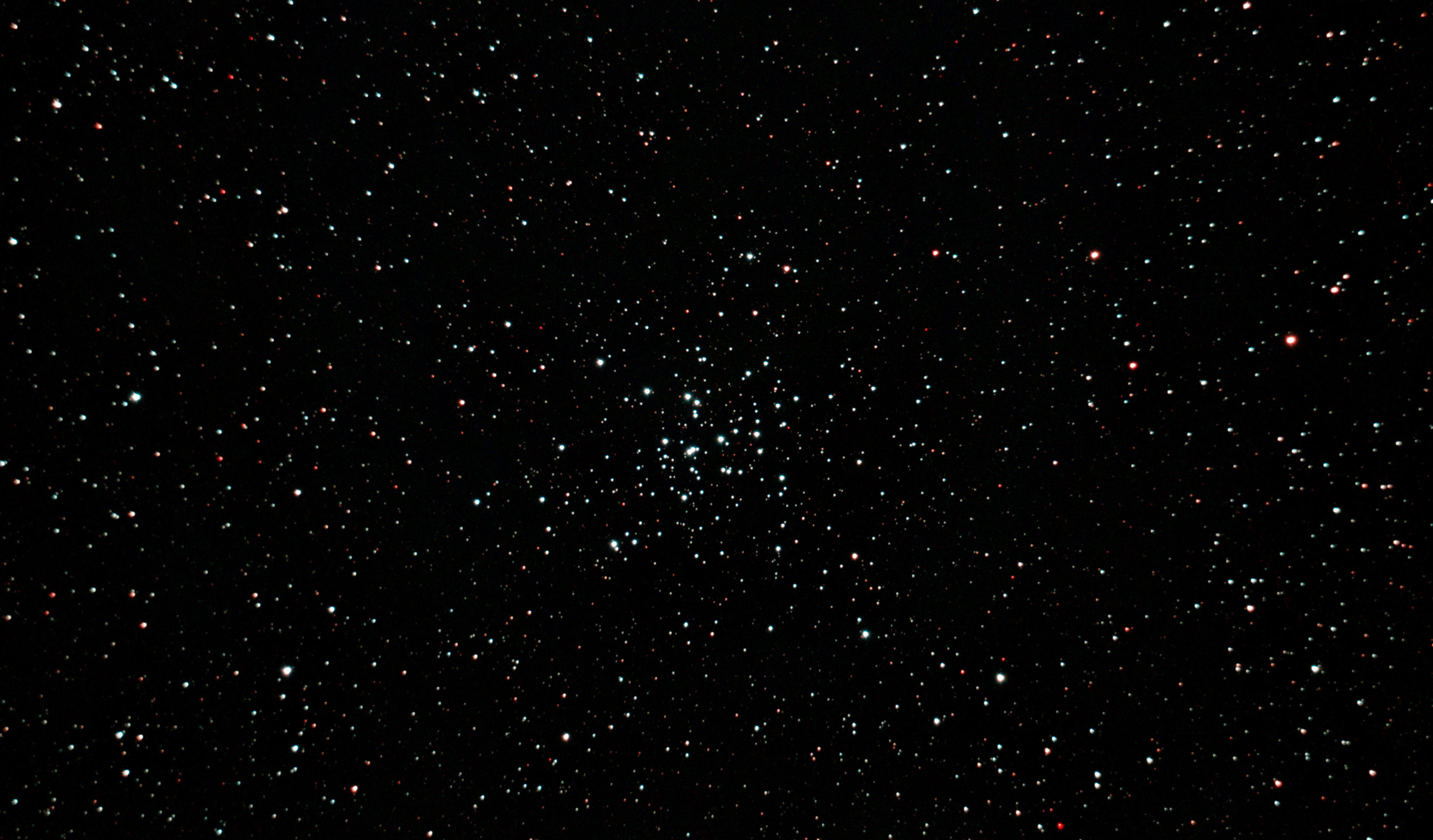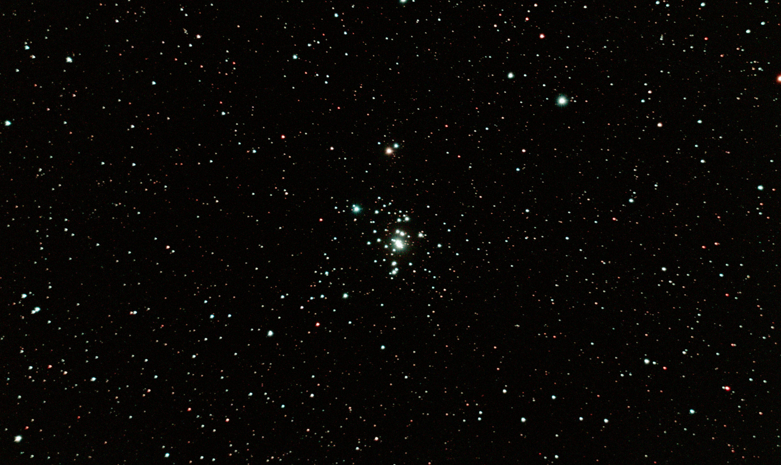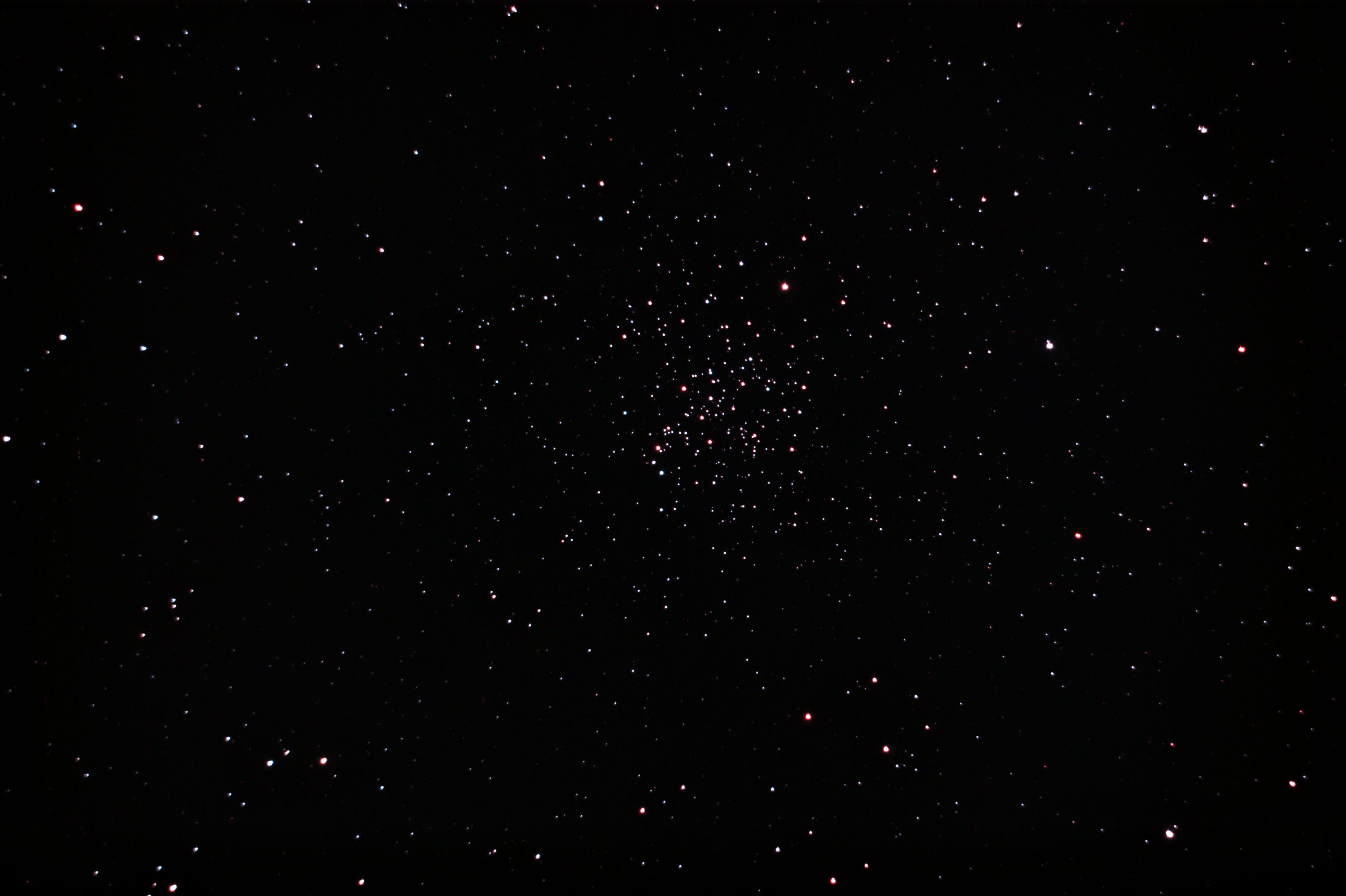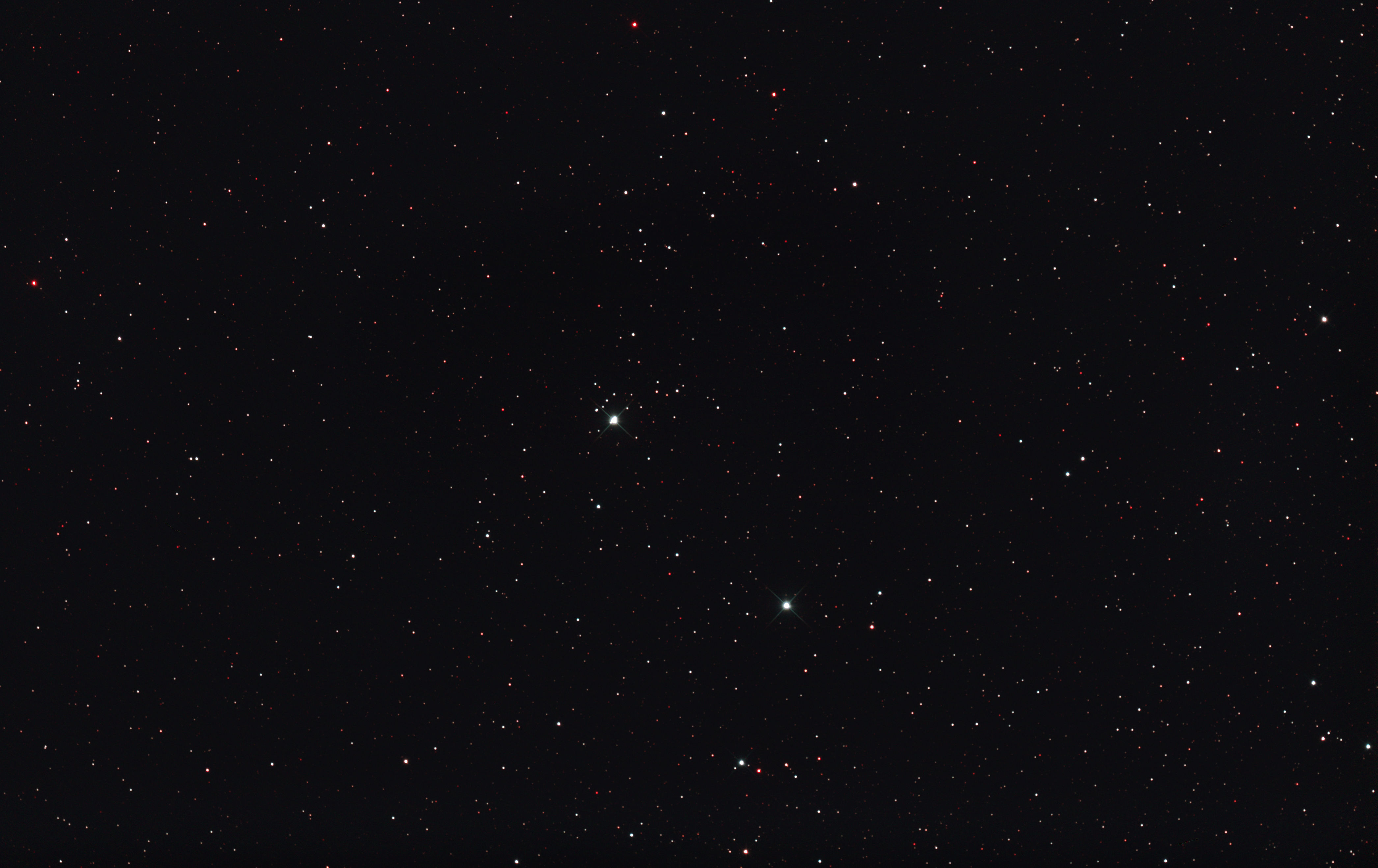 am 23.8.2015 durch 250/1016mm N-Reflektor, Canon EOS 1100Da mit CLS-Filter, 20 Bilder bei 800 ASA je 145s Sternbild Andromeda 75' 5,7m 1300 ly offener Sternhaufen |