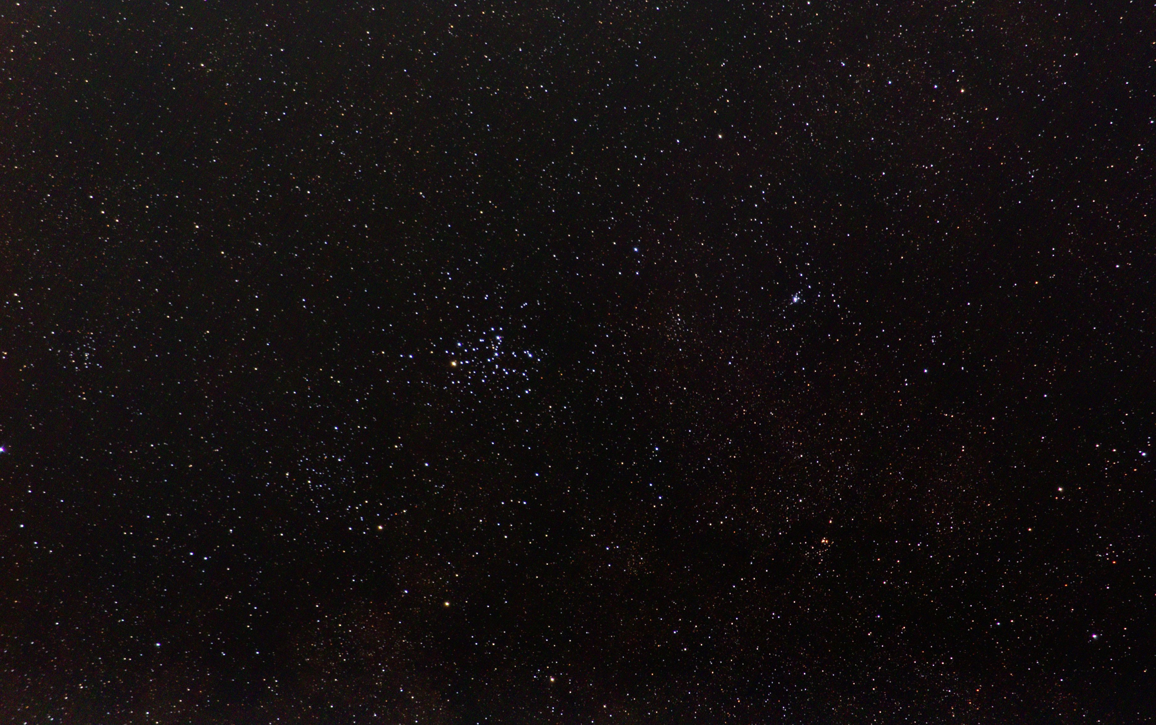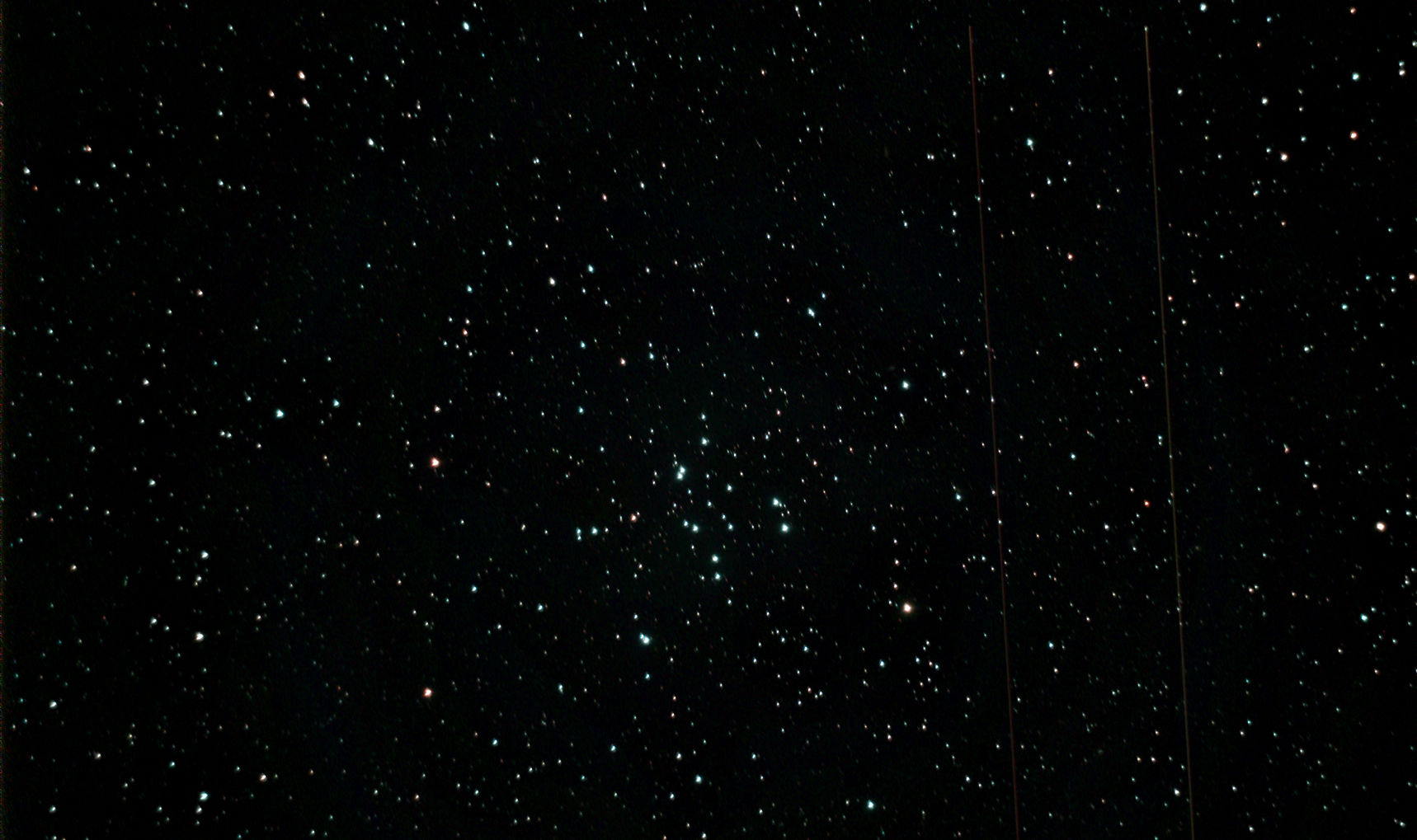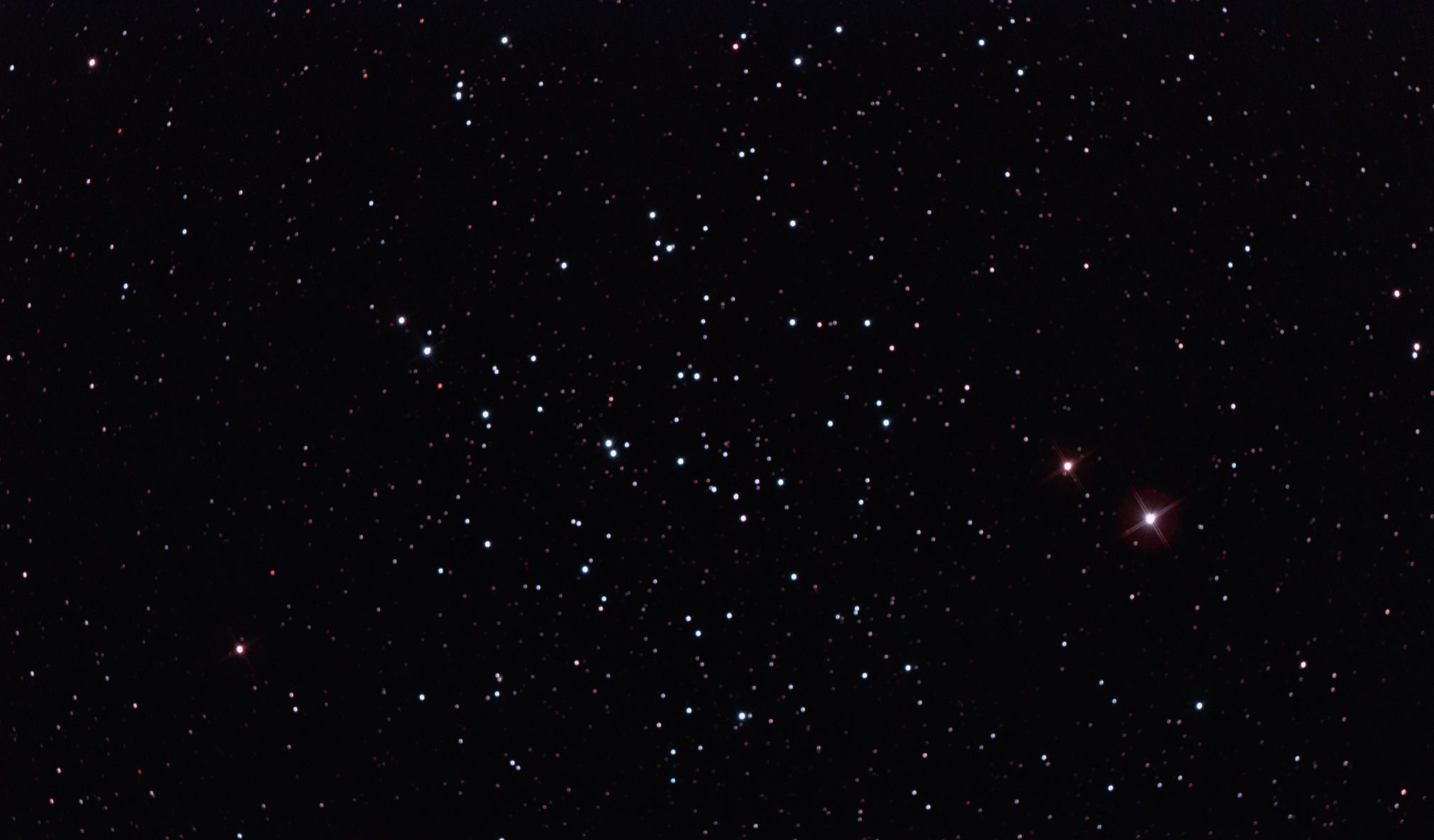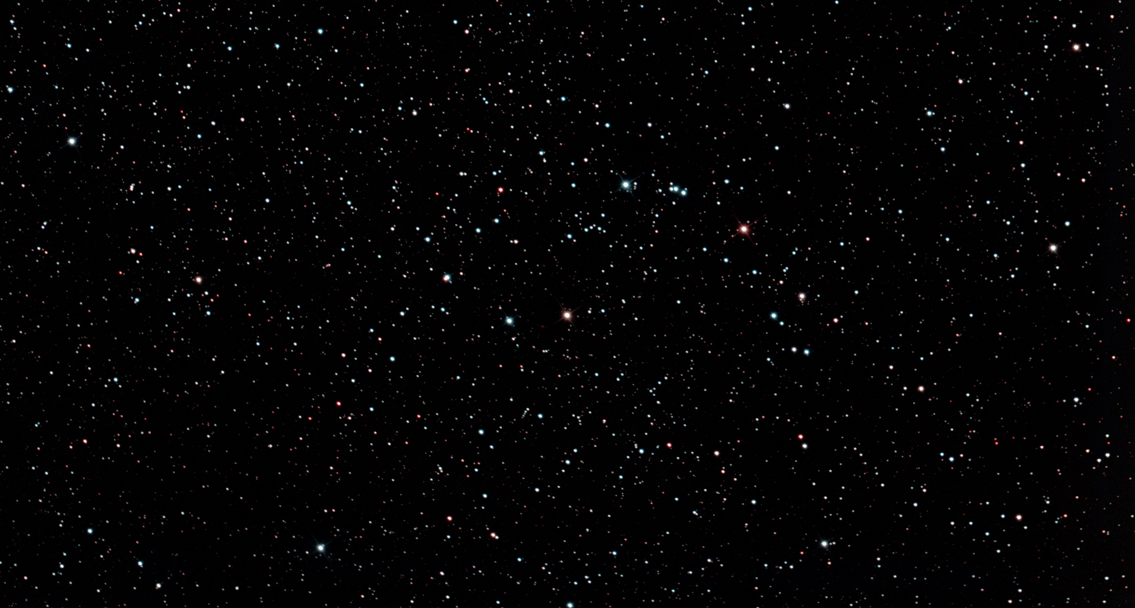 am 23.8.2015 durch 250/1016mm N-Reflektor, Canon EOS 1100Da mit CLS-Filter, 20 Bilder bei 800 ASA je 145s Sternbild Andromeda 75' 5,7m 1300 ly offener Sternhaufen |