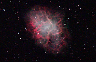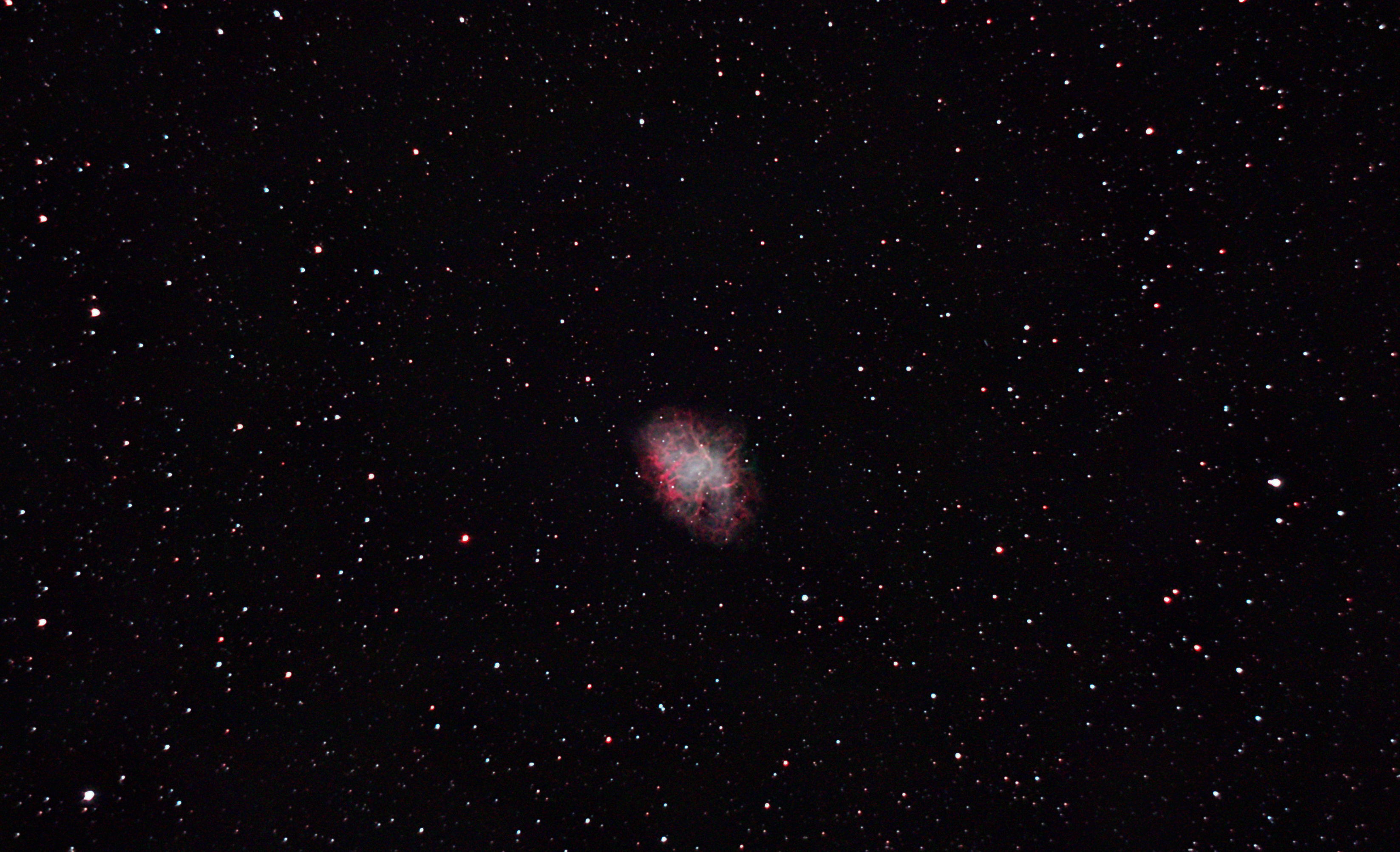 am 11.- 12.10.2015 und am 12.10.2018, 350 Aufnahmen mit je 140-145s durch das 250/1016 N im Primärfokus auf Canon EOS 1100Da bei 800 ASA, CLS Filter, addiert mit Fitswork Sternbild Stier 2,2' 10,9m 900 ly Planetarischer Nebel |
