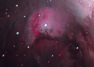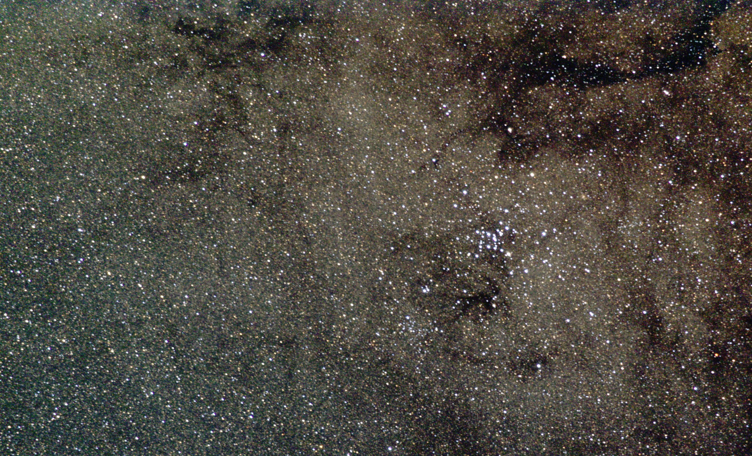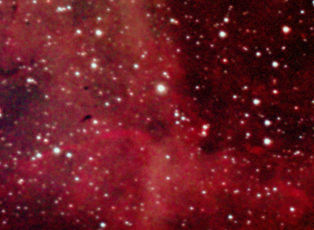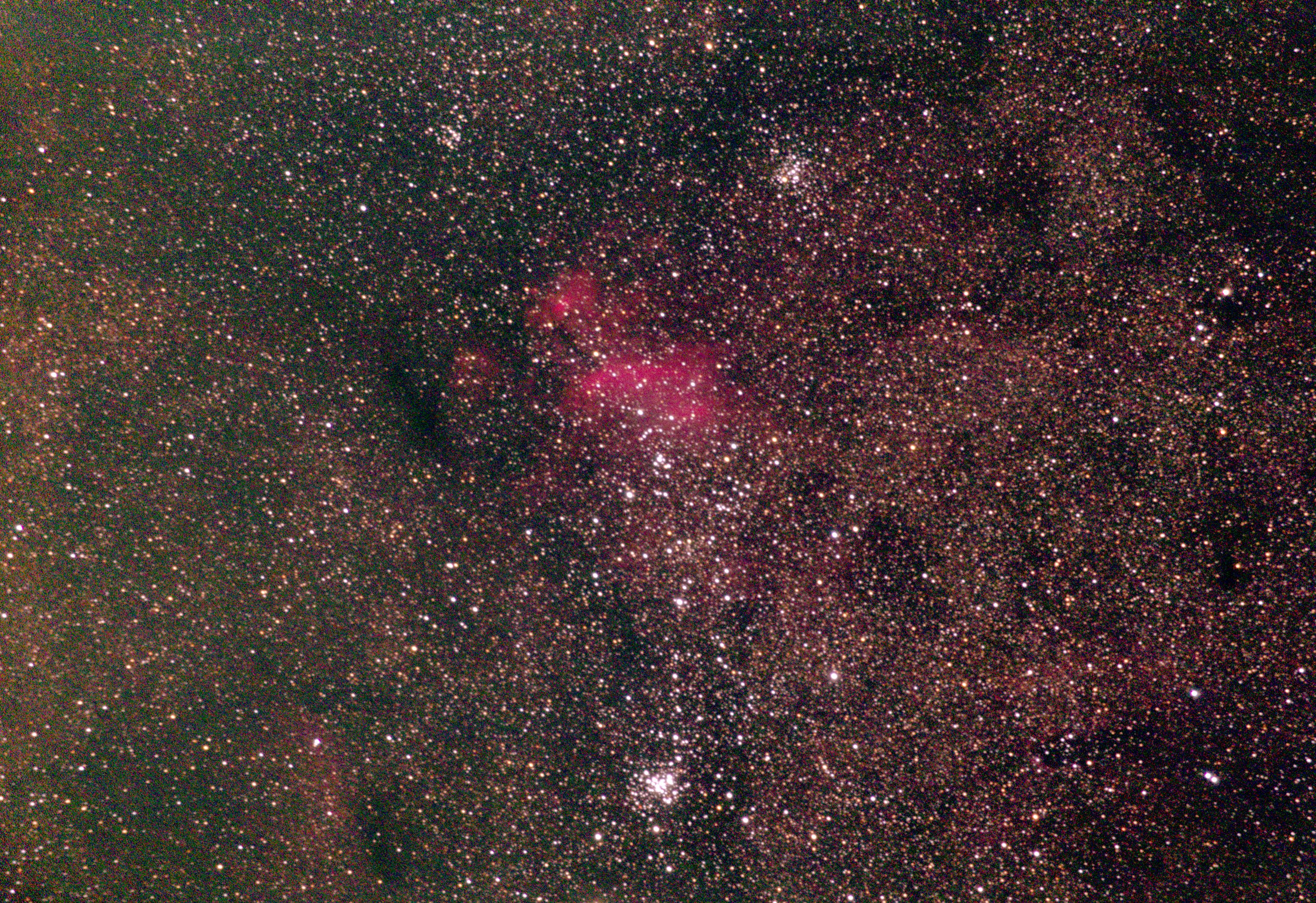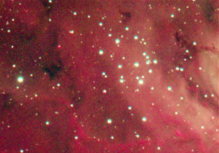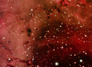 am 25.5.2012, Teleobjektiv 135mm mit Canon EOS 1100Da bei 6400 ASA, CLS-Filter, 100 Einzelbilder mit Fitswork addiert, Belichtungszeit je 20s bei f/3,5 Sternbild Schwan 120' 6m 2000 - 3000 ly Gasnebel, vorwiegend Wasserstoff |