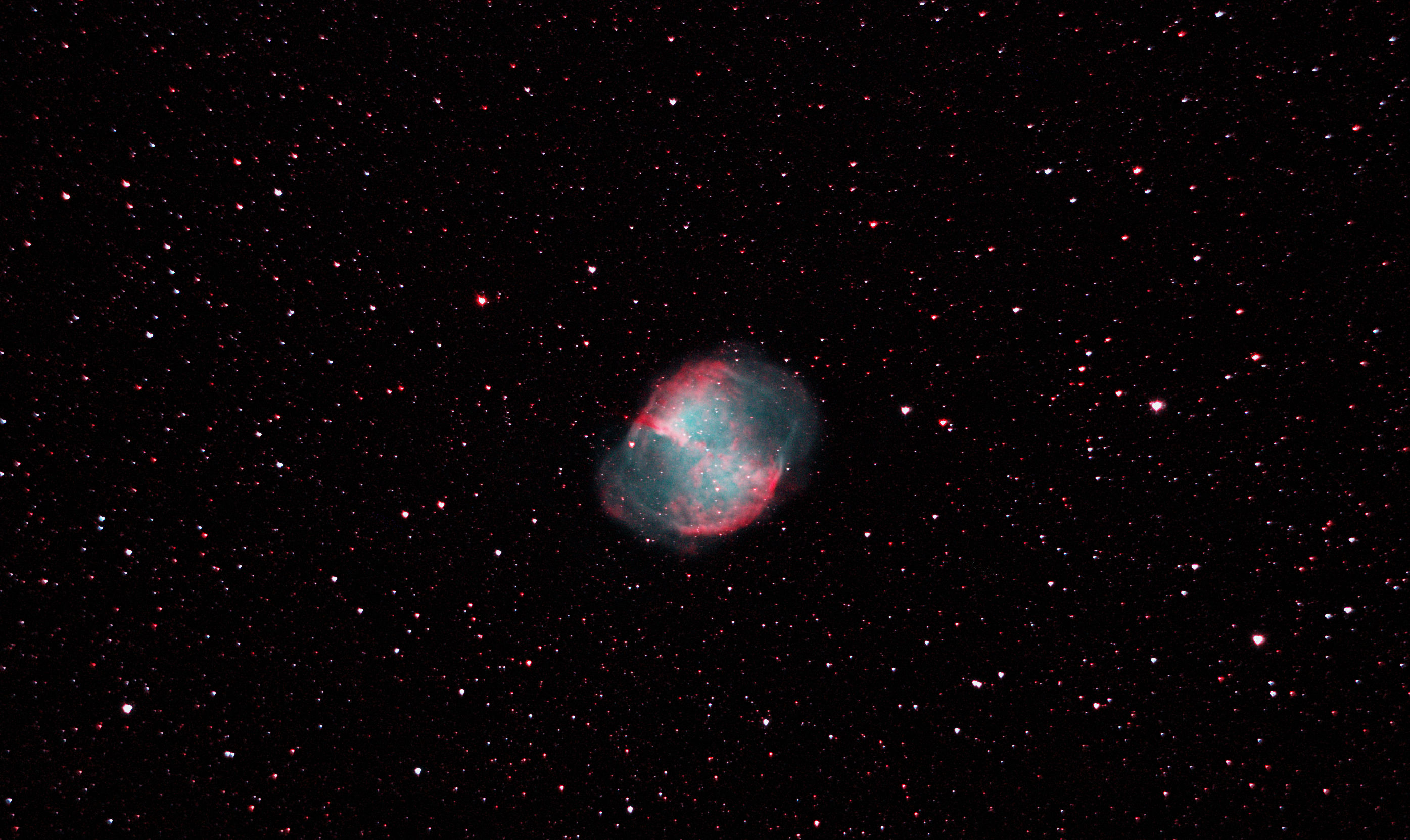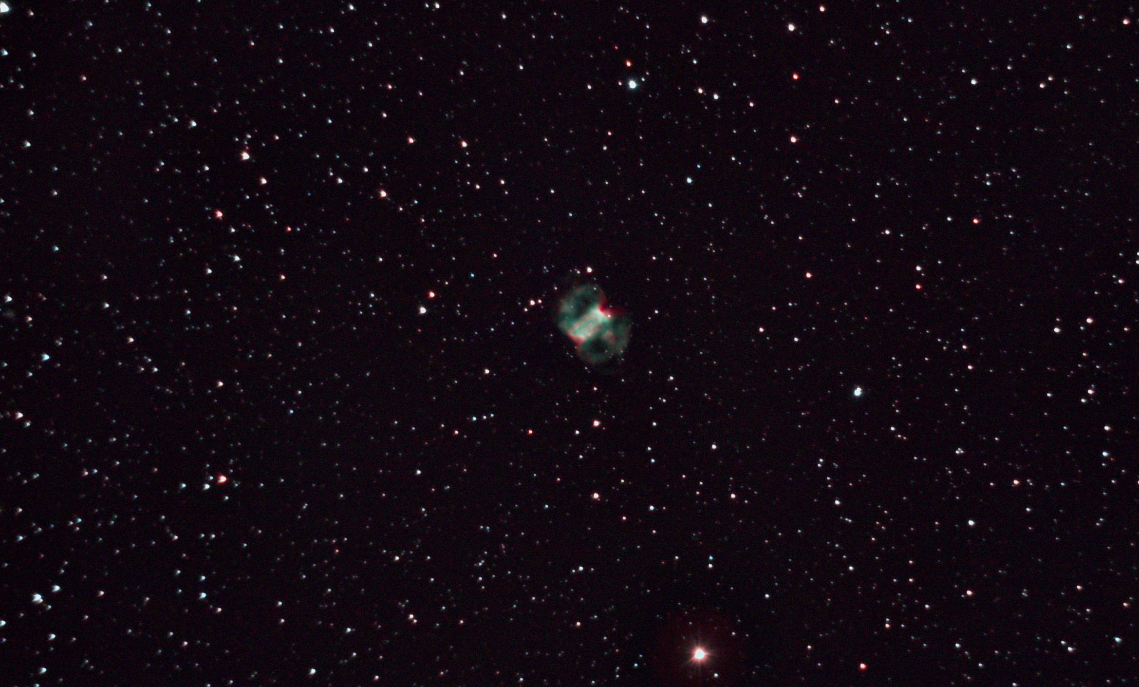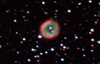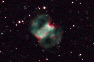 am 4.8.2013, 250/1016 SN-Teleskop, 50 Bilder, je 40 - 50s mit Canon EOS 1100Da Sternbild Füchslein 8'x5,7' 7,4m 1400 ly Planetarischer Nebel |