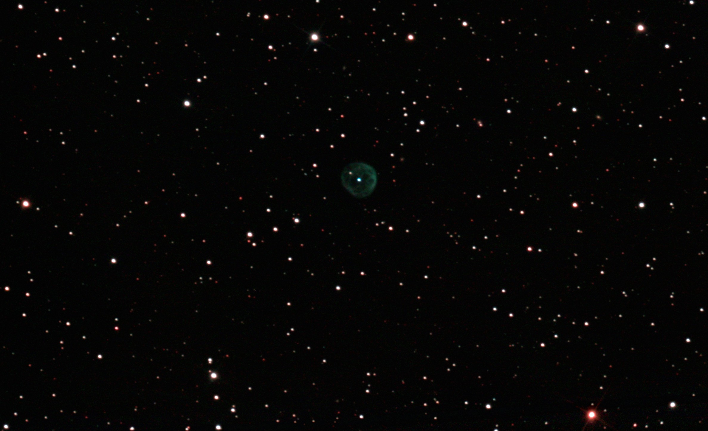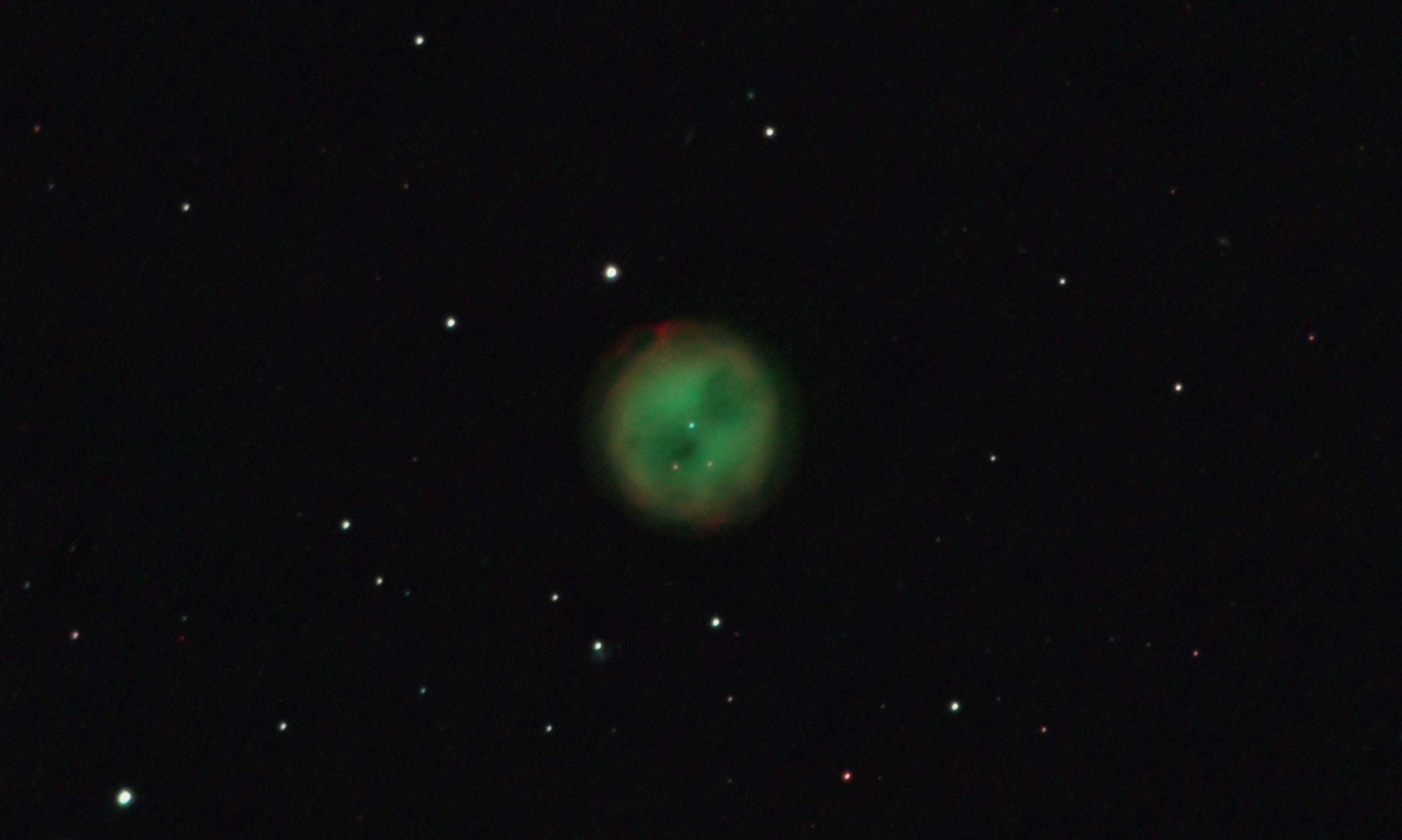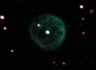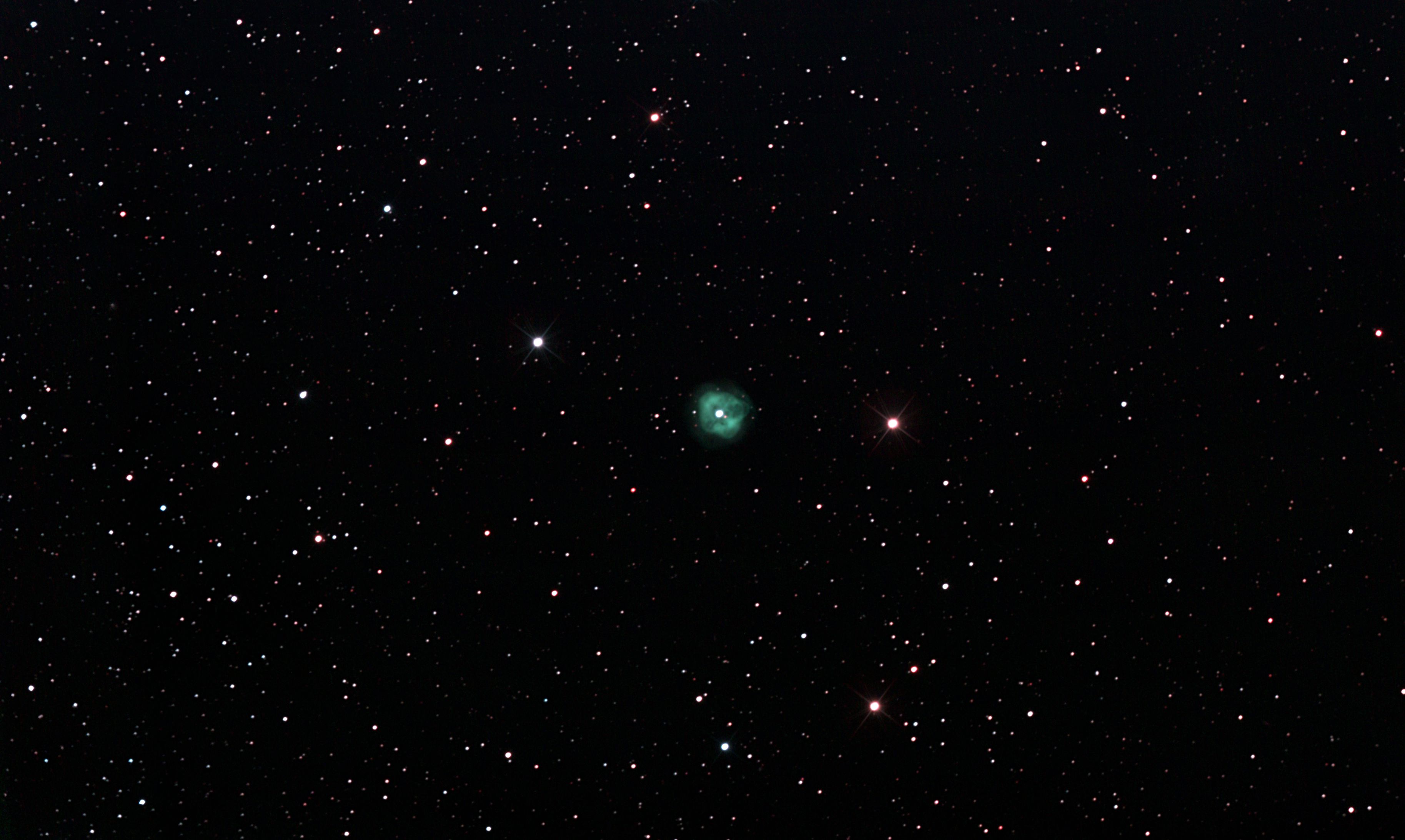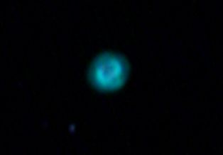 am 10.10.2019, 200 Aufnahmen je 1s-120s durch das 250/1016 N im Primärfokus mit Canon EOS 1100Da bei 800 ASA, CLS Filter, addiert mit Fitswork Sternbild Andromeda 0,6' 8,3m verschiedene Angaben zwischen 1800ly und 5000 ly Planetarischer Nebel; Wind ließ das Teleskop schwingen |