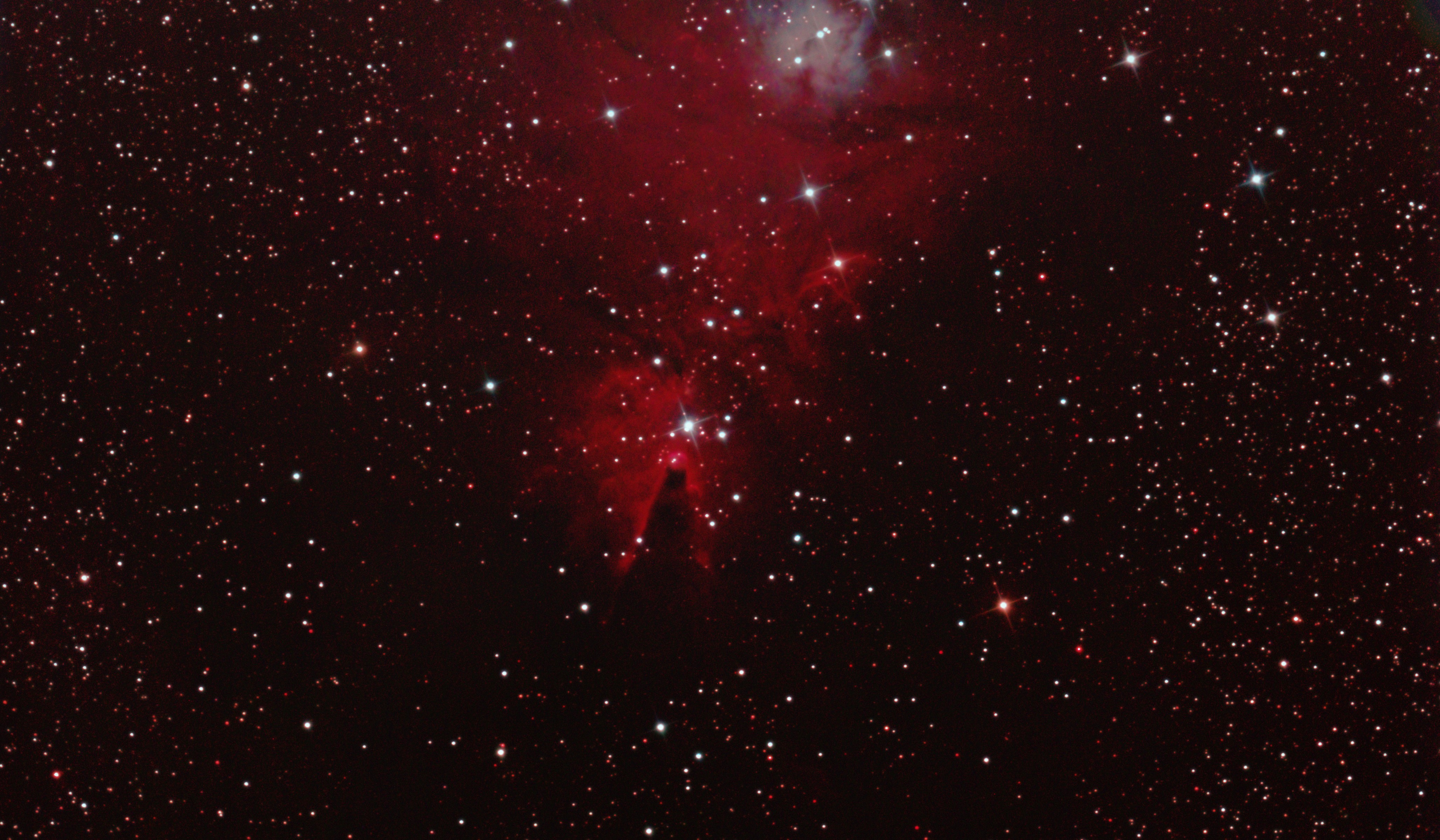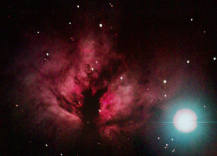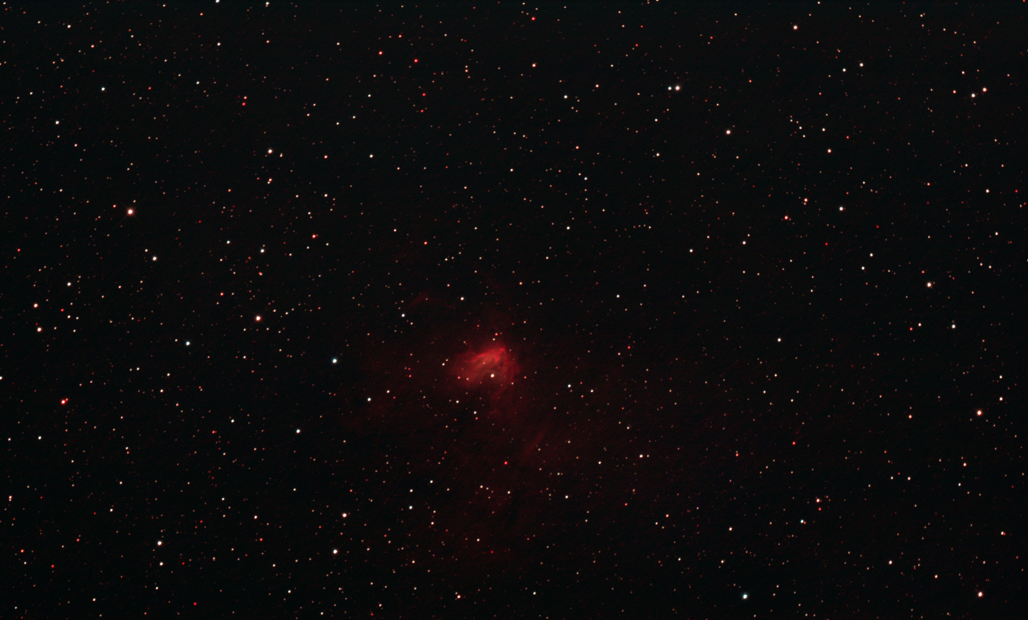 am 30.10.2019, 120 Aufnahmen mit Canon EOS 1100Da je 80s bei 800 ASA, CLS-Filter, belichtet im Primärfokus des 250/1016 N Sternbild Perseus 25' unbekannt 9800 ly Gasnebel, HII-Region |