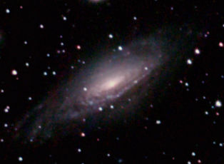 am 21.10.2012, 105 Aufnahmen mit je 25s durch das 250/1016 SN im Primärfokus auf Canon EOS 1100Da bei 6400 ASA, CLS Filter, addiert mit Fitswork Sternbild Pegasus 5,5'x2,3' 10,8m 43 Millionen ly Spiralgalaxie |