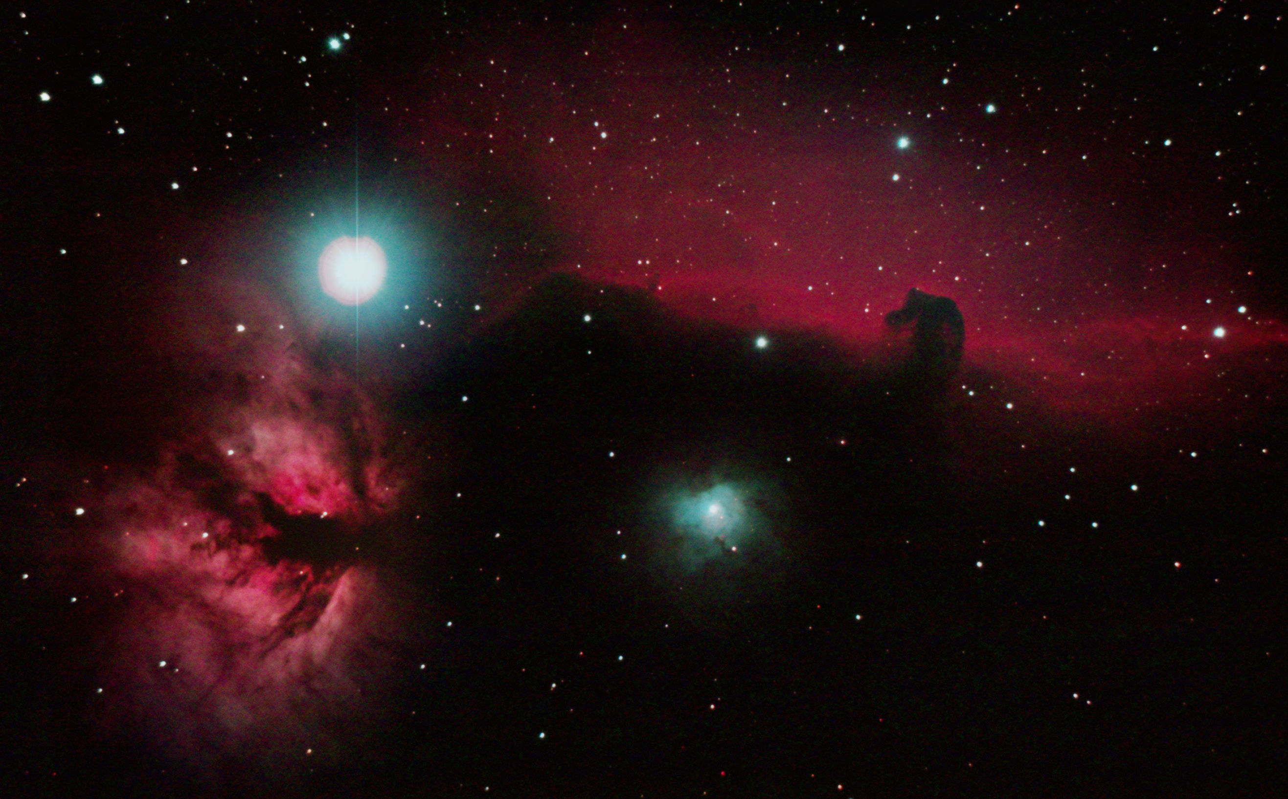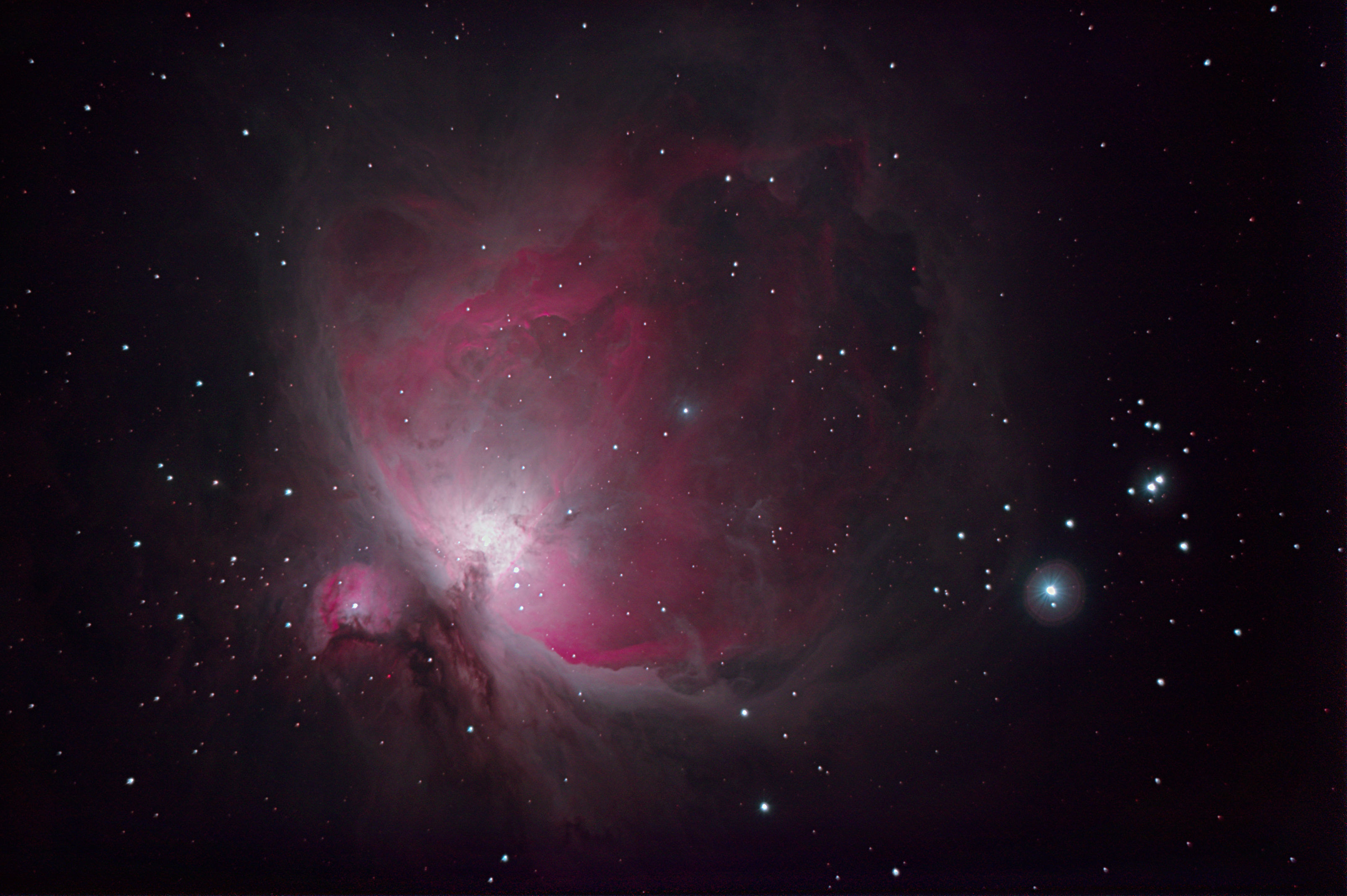 am 2. und 3.10.2013, Belichtungszeit 6h, Einzelbilder je 30s durch das 250/1016 SN im Primärfokus auf Canon EOS 1100Da bei 6400 ASA, CLS-Filter, addiert mit Fitswork Sternbild Pegasus 0,9'x0,4'
