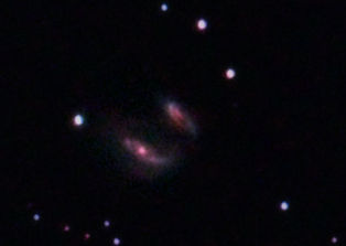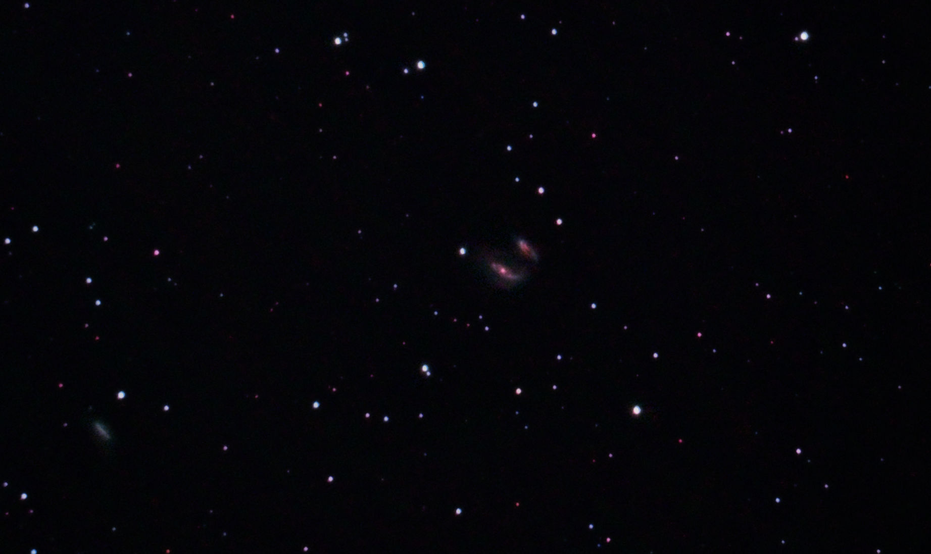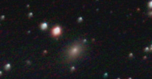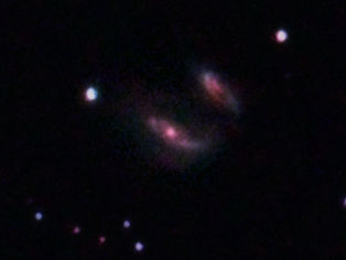 am 21.4.2018, 28 Aufnahmen mit Canon EOS 1100Da je 150s bei 800 ASA belichtet im Primärfokus des 250/1016 N Sternbild Herkules 0,6'x0,3' 16,6m 1,4 Milliarden ly Galaxie mit Quasar (in der Übersichtsaufnahme Bildmitte) |
