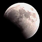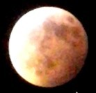 Das vierte Bild zeigt den total verfinsterten Mond. Ich habe die Helligkeit der Videokamera so weit erhöht, dass der Mond trotzdem gut zu sehen ist. Die rötliche Färbung der Mondoberfläche durch das Streulicht der Erdatmosphäre ist deutlich zu erkennen. Da sich der Mond nicht genau im Zentrum des Kernschattens der Erde befand, ist er nicht gleichmäßig verdunkelt. Rechts unten neben dem verfinsterten Mond ist ein Stern des Sternbildes Zwillinge zu erkennen. Das fünfte Bild zeigt, wie der Mond den Kernschatten wieder verlässt. ( Helligkeit wieder reduziert ) |