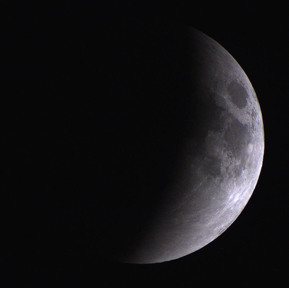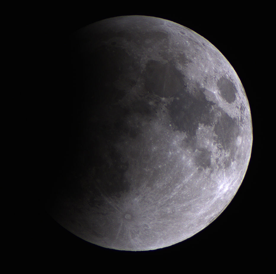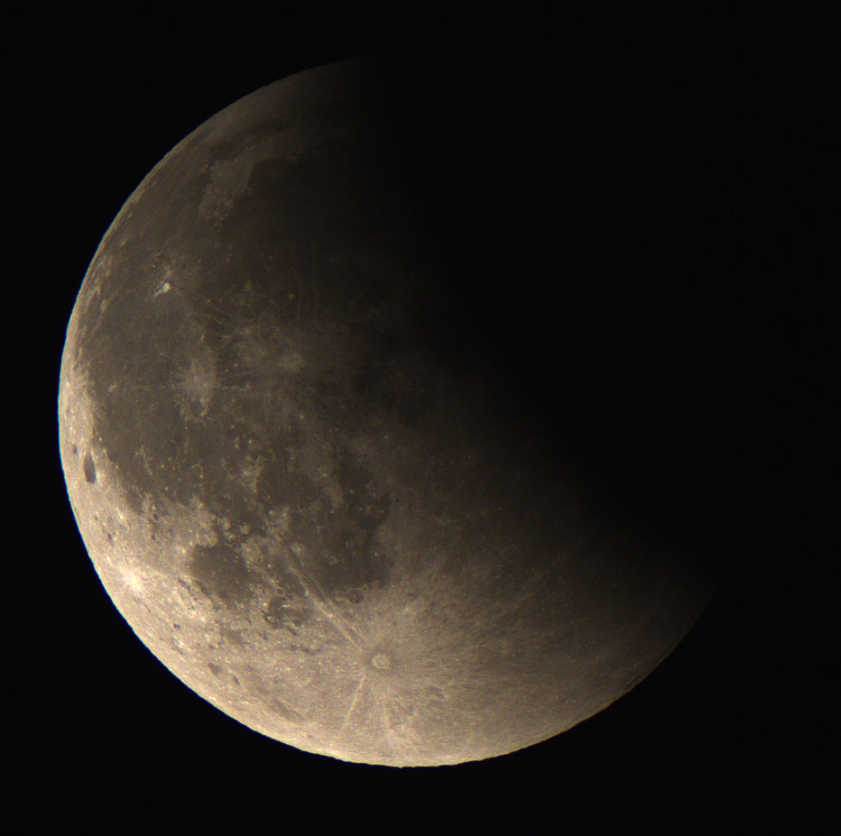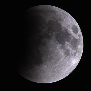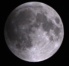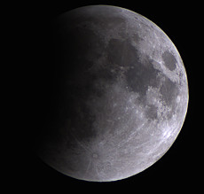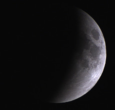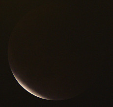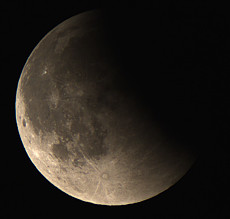 In der Aufnahme von 2:31 Uhr ist noch nicht zu erkennen, dass der Halbschatten der Erde bereits einen Teil der Mondoberfläche verfinstert. Aber in der Aufnahme von 2:57 Uhr wirkt die linke Mondseite schon etwas dunkler. 3:23 Uhr hat der Kernschatten schon einen Teil der Oberfläche bedeckt. |