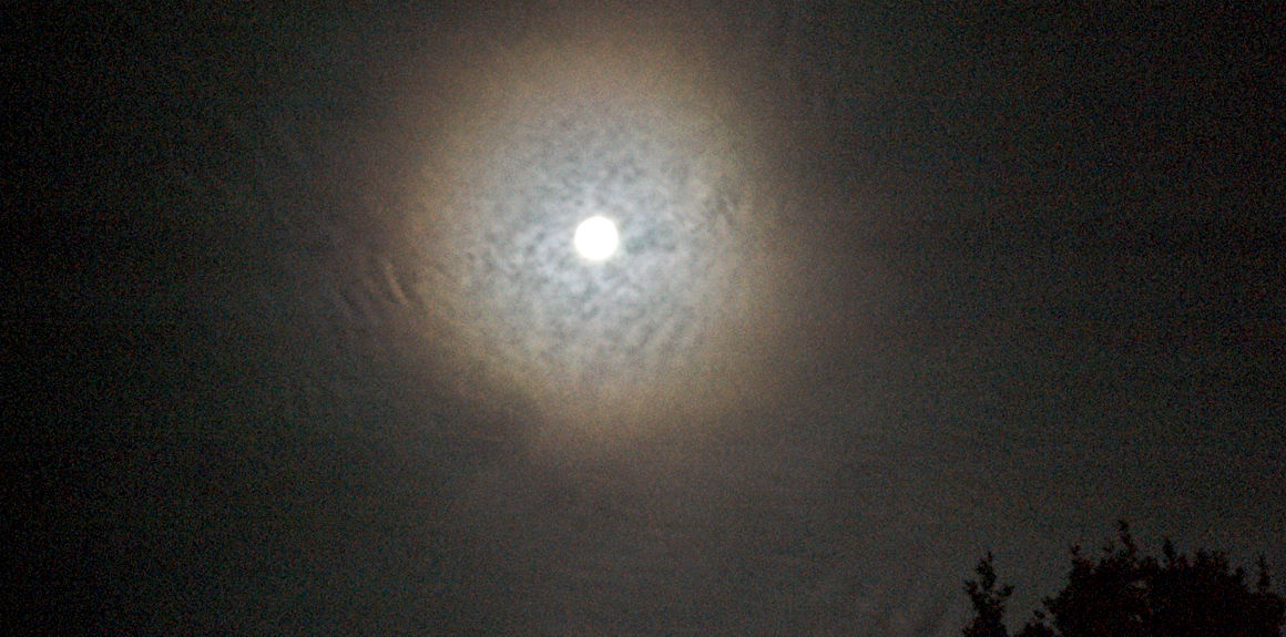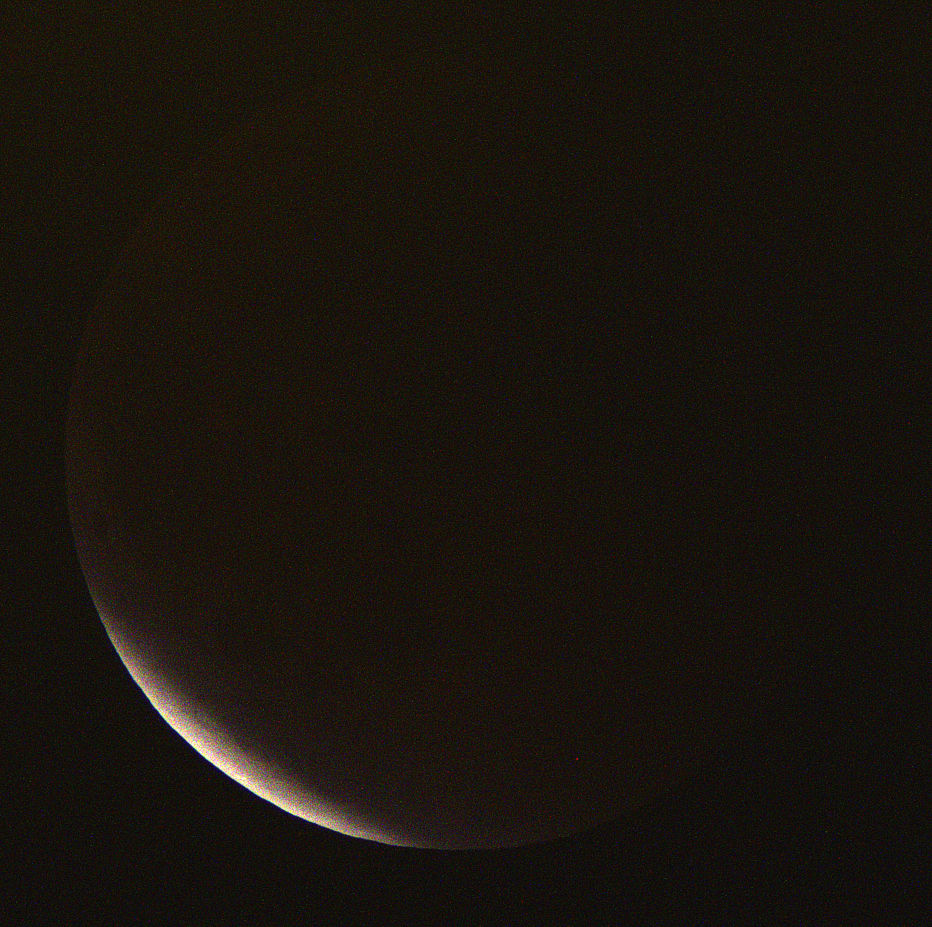 So stellte sich der Himmel zur totalen Mondfinsternis 2015 dar. Es war nahezu klar, aber trotzdem zogen ständig dünne Zirruswolken vorüber. Diese beeinträchtigten die Beobachtung nur wenig, führten aber zu Helligkeitsschwankungen in den Mondaufnahmen. Aufnahme 2:40, 1/6s bei 800 ASA mit Pentax Ist DL2, verstärkt |