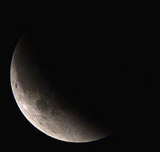 Um 4: 29 Uhr ist die Totalität schon seit einigen Minuten eingetreten. Ich hatte bereits vorher begonnen, die Belichtungszeit und die Empfindlichkeit kontinuierlich zu erhöhen, um während der Totalität etwas auf dem Bild zu haben. Die Werte waren dann 1s Belichtungszeit bei 6400 ASA. Während dieser Phase machten sich die Zirruswolken stärker bemerkbar. Sie beeinträchtigten den Kontrast der Aufnahmen zum Teil deutlich und hellten den Hintergrund auf. Trotzdem ist in den Aufnahmen von 4:29 und 4:45 Uhr die kupferrote Färbung der Mondoberfläche gut zu sehen. Die Bildstörungen wurden stärker und so begann ich schon kurz vor dem Ende der Totalität die Belichtungszeit wieder zu verringern. In der Aufnahme von 5:31 Uhr ist schon wieder fast die Belichtungszeit von 1/160s erreicht. Inzwischen nähert sich der Mond dem Horizont. Kurz vor dem Ende der Finsternis wird er bereits untergehen. Hier färbt die Atmosphäre die Mondoberfläche ein wenig braun, wie im Bild von 6:15 Uhr zu sehen ist. |