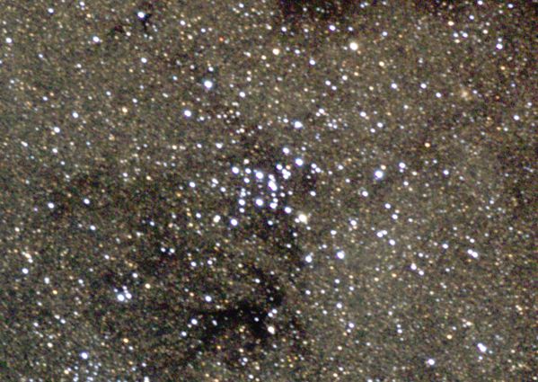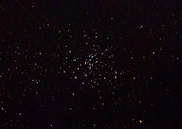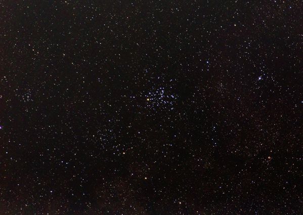 Der Vollmond befand sich während der Aufnahme nur etwa 20° neben diesem Sternhaufen. So war nur noch eine Belichtungszeit von 5s möglich. Die Sterne dieses eigentlich prächtigen Sternhaufens erscheinen eher blass. Wer macht auch schon bei Vollmond Deep Sky Aufnahmen ?
