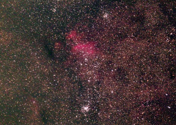 In diesem Bild nahm ich M 8 und M 20 im Sternbild Schütze als Ziel. Später stellte ich fest, dass ja auch M 21 mit drauf ist. M 21 ist ein offener Sternhaufen in einer Entfernung von etwas mehr als 4000 ly. M 20 wird auch als Trifidnebel bezeichnet und ist über 5000 ly entfernt. Mehr Informatinen zu M8, dem Lagunennebel gibt es hier. Im ganzen Bild sind im Hintergrund die Sternenwolken der Milchstraße sichtbar. Die hier aufgenommenen Objekte befinden sich visuell recht nahe dem Milchstraßenzentrum.