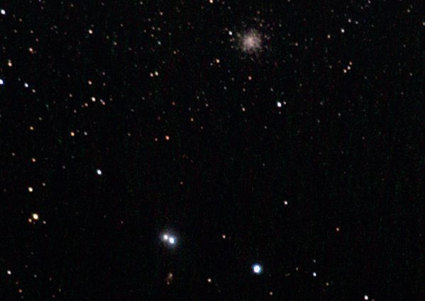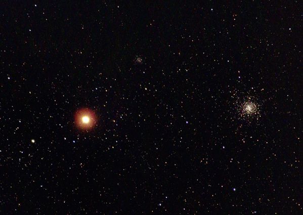 Dennoch ist das gesuchte Objekt, hier der Kugelsternhaufen M 19, in der Aufnahme zu erkennen. Mit 17 Bogenminuten Durchmesser ist er nicht gerade groß für diese Optik. M 19 befindet sich in einer Entfernung von etwa 28 000 ly und leuchtet mit etwa 7m. Unter den äußeren Bedingungen sind die Sternenwolken der Milchstraße nicht mehr zu erkennen.