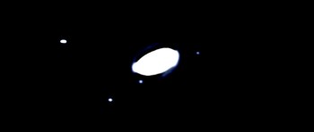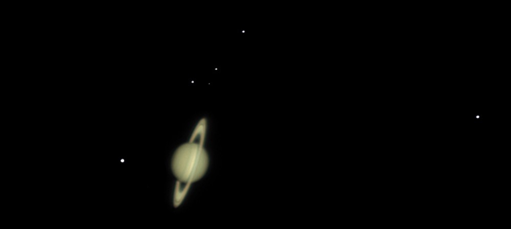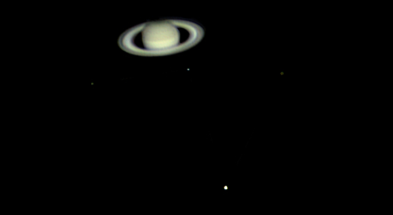 Wie darunter beschrieben wertete ich die Videoaufnahme erneut aus. Durch eine extreme Kontrast- und Helligkeitsverstärkung wurden 4 Saturnmonde sichtbar. Der Saturn war allerdings nur noch ein weißer Fleck, der alles überstrahlte. So ersetzte ich ihn durch das ursprüngliche Bild. Im Ergebnis sind die Monde Rhea, Tethys, Enceladus und Dione zu sehen (v.l.n.r.). Mimas ist theoretisch auch im Bild, etwas über Tethys. Da er allerdings mehr als eine Größenklasse schwächer ist als Enceladus und sich nah am Saturn befindet, wurde er hier nicht sichtbar. |