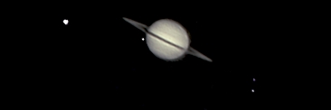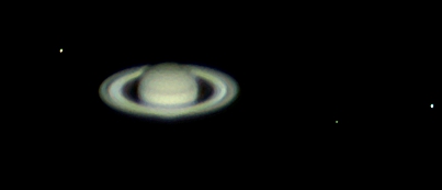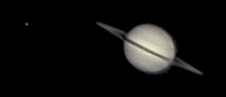 In dieser Aufnahme gelang es mir erstmals einen Saturnmond (Titan) gleichzeitig mit dem Planeten bei "normaler" Belichtung aufzunehmen. Dieser erscheint dann allerdings recht schwach. |