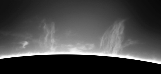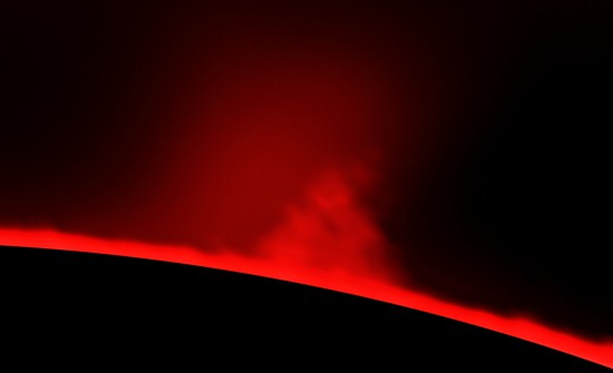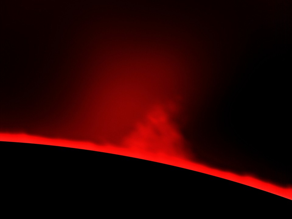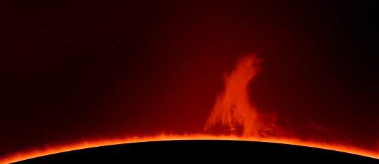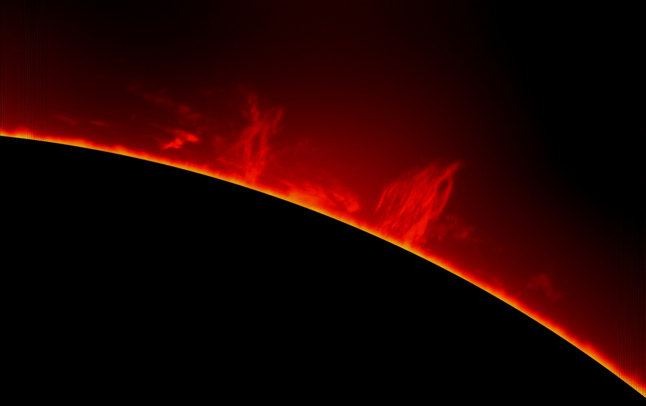 Zum Größenvergleich habe ich rechts in der Darstellung einen Kreis von etwa der Größe der Erde im Verhältnis zur Sonne einkopiert. Damit lässt sich abschätzen, dass die Protuberanzen eine Höhe von mehr als 50 000 km erreichen. Damit gehören sie allerdings noch zu den kleineren.