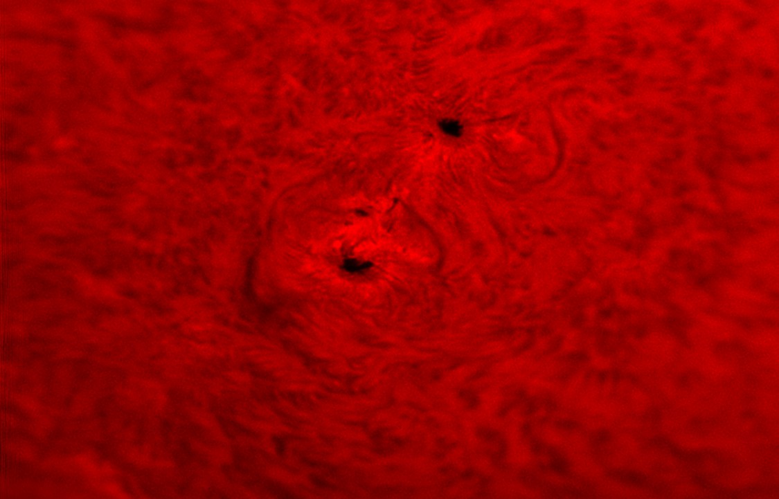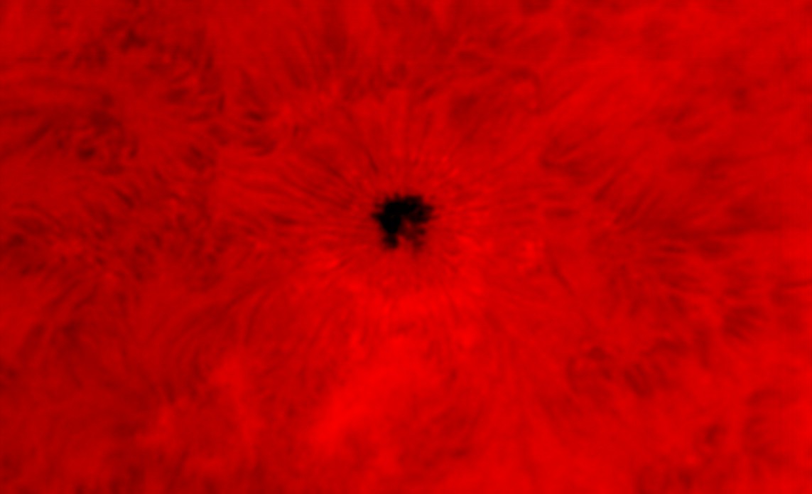 Bei dieser hohen Vergrößerung eine bestimmte Stelle auf der Sonnenoberfläche zu finden, gestaltet sich schwierig. Nach einiger Suche fand ich dann diesen Sonnenfleck. Im H-Alpha-Licht wird die Struktur der Penumbra trotz des ungünstigen Seeings sichtbar. Nach Addition vieler Bilder werden in der Umgebung weitere Strukturen sichtbar.