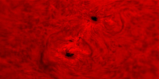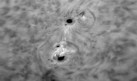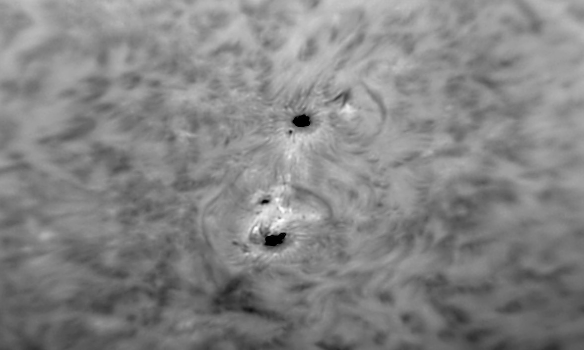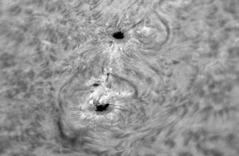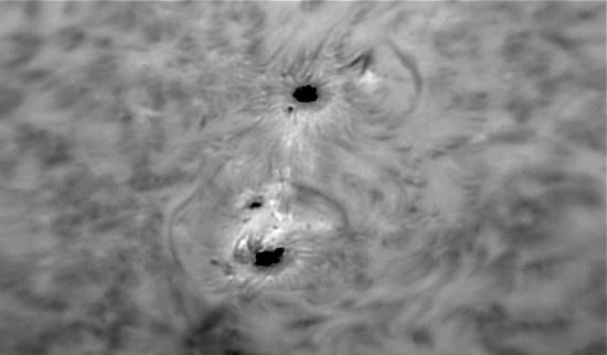 In den letzten beiden Aufnahmen habe ich die Kamera auf schwarz/weiß umgestellt. Gleichzeitig wählte ich die höchste Bittiefe. Es handelt sich hier um die gleichen beiden Sonnenflecken, wie im dritten Bild von oben. Die schwarz/weiß-Darstellung scheint hier einen größeren Kontrast zu erzeugen.