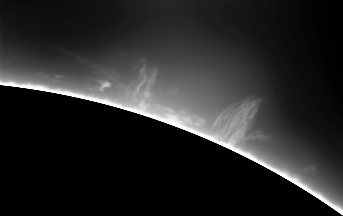 Die gleichen Protuberanzen wie in Bild 5 sind hier noch mal in schwarz/weiß zu sehen. In diesem Fall ist das Ergebnis schlechter als in der Farbaufnahme. Trotz höherer Bittiefe haben die Graustufen in der vergrößerten Aufnahme erkennbare Ränder. |