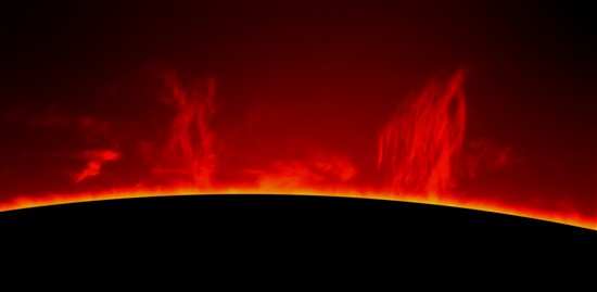 Im H-Alpha Licht, einer Spektrallinie des Wasserstoffs, werden viele Strukturen der Chromosphäre sichtbar. Weiterhin sind häufig Protuberanzen in der Sonnenkorona zu sehen. Die dafür nötigen Filter sind allerdings nicht so einfach herzustellen und deshalb recht teuer. Sie müssen extrem schmalbandig sein, um nur diese Spektrallinie passieren zu lassen. |