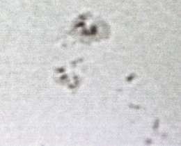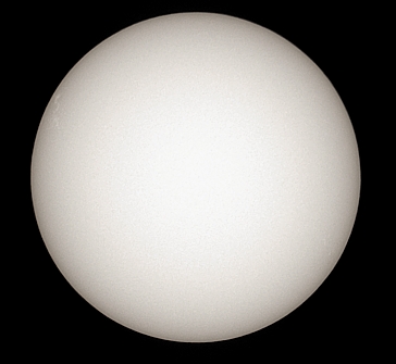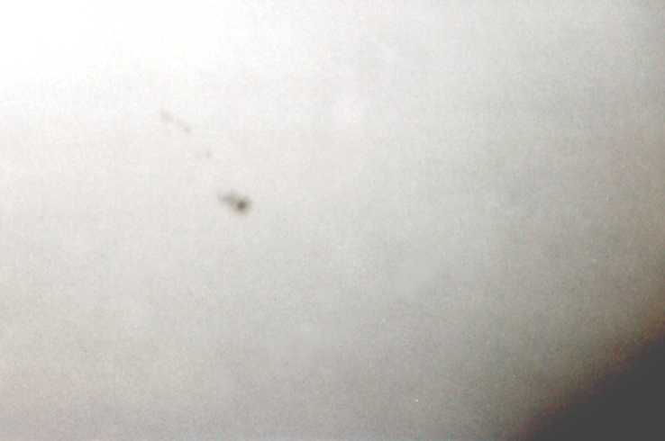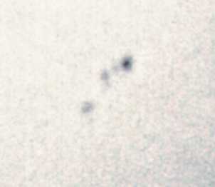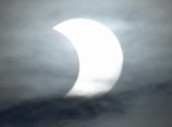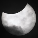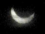 Diese partielle Sonnenfinsternis war wegen dichter Bewölkung leider nahezu vollständig "unsichtbar". Wegen der schlechten Wetterprognosen hatte ich eine Aufnahme der Finsternis gar nicht erst eingeplant. Nur für sehr kurze Zeit, kurz vor dem Maximum, war die Wolkendecke an einer Stelle dünn genug, um ein wenig Sonnenlicht hindurchzulassen. Eine einzelne unscharfe und grobkörnige Aufnahme gelang mir in diesem Moment. |