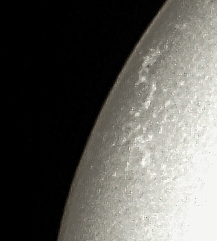Die ersten Bilder mit dem neuen 10" - Teleskop (250/1000 Schmidt - Newton - Spiegel) sind noch nicht perfekt, zeigen aber eine höhere Auflösung und mehr Kontrast. Zwei Probleme, die ich noch nicht beheben konnte, traten beim Filmen auf. Auf dem Kamerachip wird die Teleskopöffnung mit dem Hilfsspiegel unscharf mit abgebildet, was links auf dem verkleinerten Sonnenbild als halbkreisförmige Aufhellung im unteren Teil zu erkennen ist. Weiterhin wird das Gesamtbild dreieckig abgeblendet, was ich mir bisher überhaupt nicht erklären kann. |