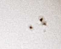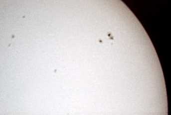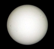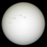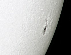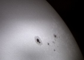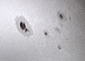 Zu meinen ersten Aufnahmen mit der ToUCam Pro II gehört das folgende Bild eines kleinen Sonnenflecks am Sonnenrand. Alle visuell sichtbaren Details sind auch in der Aufnahme zu erkennen. Der Vorteil von Aufnahmen mit der Webcam ist, dass man das Ergebnis direkt auf dem Monitor kontrollieren und Werte für Belichtungszeit, Helligkeit, Kontrast und Gamma entsprechend anpassen kann. Eine Okularprojektion scheint bei dieser Methode nicht notwendig zu sein. Der Aufnahmechip der Kamera ist sehr klein. Darauf wird nur ein winziger Teil des Bildfeldes abgebildet. Auf diesem Bild ist die Sonne deshalb so groß zu sehen wie auf einem normalen Foto bei etwa 10 m Brennweite. |