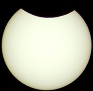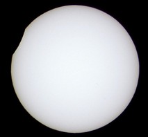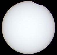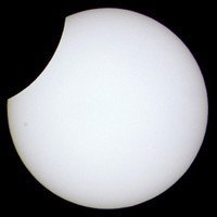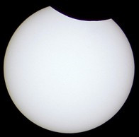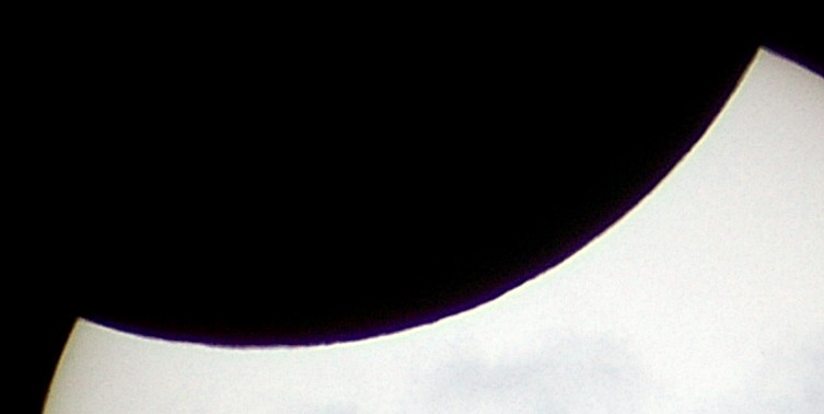 Das folgende Bild ist ein vergrößerter Ausschnitt der Aufnahme im Maximum der Finsternis. Bei starker Vergrößerung wird auf der Sonnenscheibe die Silhouette des Mondrandes mit seinen Kratern sichtbar.