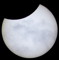 Auch diese Sonnenfinsternis war in Deutschland nur als partielle Sonnenfinsternis zu sehen. Da die Wetterprognosen hier passend zur Finsternis wieder einmal nicht gut waren (Regen und Sturm), baute ich nur den 63/840 mm Refraktor auf. Erstaunlicherweise blieb der Himmel bis auf einige Wolken fast klar. So konnte ich die Finsternis nahezu in ihrem gesamten Verlauf beobachten. Nur wenige Minuten wurde die Sonne vollständig durch Wolken verdeckt. Oft erschienen aber schwächere Wolkenschleier vor der Sonnenscheibe. Mit etwa 15 % Verdeckung gehörte diese Finsternis sicher nicht zu den eindrucksvollsten.