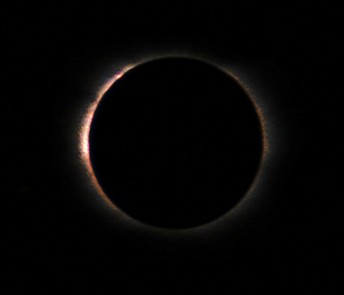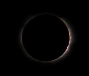 Während der Totalität wird dann am Sonnenrand die Chromosphäre als schwach rötlich leuchtende dünne Schicht sichtbar. Weiterhin kann man rötliche Protuberanzen erkennen. Zurzeit ist die Aktivität der Sonne aber recht gering. Die Protuberanzen sind daher recht klein. |