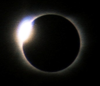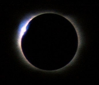 Sekunden danach erscheint das Perlschnurphänomen. Die Unebenheiten der Mondoberfläche lassen nur noch kleine Teile der winzigen Sonnensichel erkennen, die dann wie Perlen leuchten. Dieses Phänomen ist auf dem Bild nur ansatzweise zu erkennen. Oben links wird schon eine kleine Protuberanz sichtbar. |