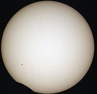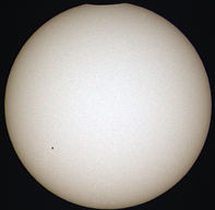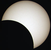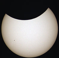 Nutzt man die Wiederhol-Funktion des Video-Players, ist beim Neustart der Animation am Sonnenfleck zu erkennen, dass sich die Sonne während der etwa zweieinhalb Stunden der Finsternis bereits ein wenig gedreht hat. |