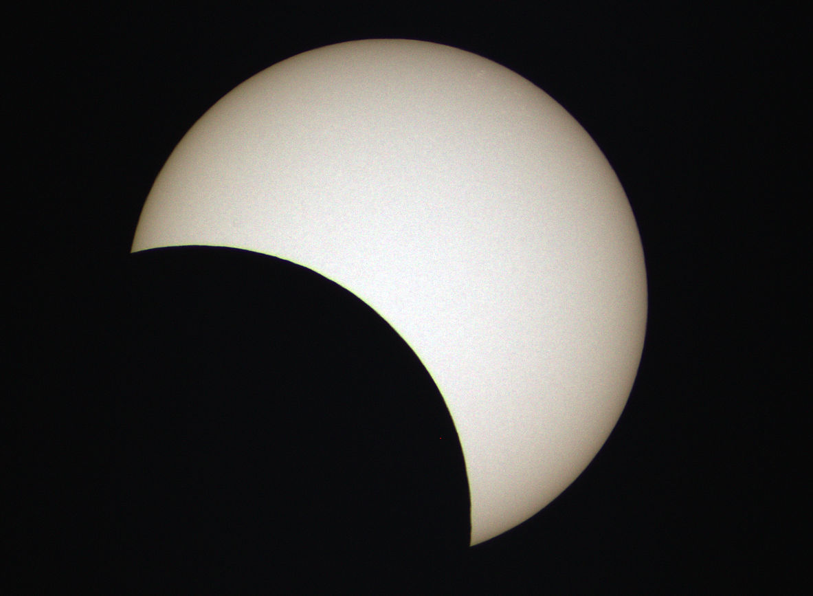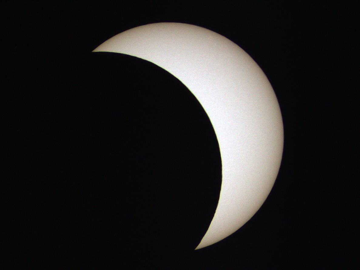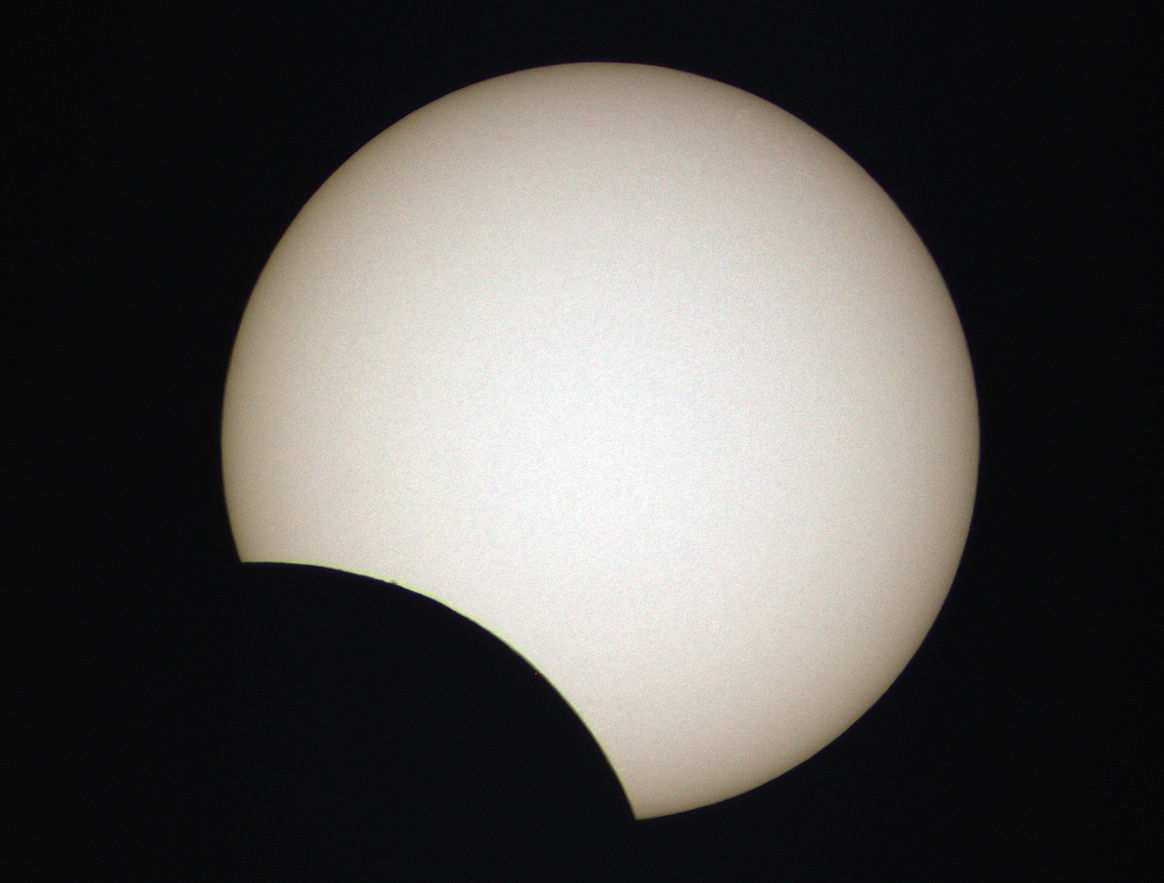 Zum ersten Mal gelang es mir, eine Sonnenfinsternis bei gutem Wetter aufnehmen. Keine einzige Wolke trübte das Ereignis. So konnte ich jede Minute während des gesamten Verlaufs ein Foto belichten. Glücklicherweise begann ich schon 9:30 Uhr mit den Aufnahmen. Denn der erste Kontakt war bereits 2 Minuten früher zu sehen, als erwartet. 9:36 Uhr begann sich der Mond vor die Sonne zu schieben. Zum Maximum 10:48 Uhr war die Sonne zu etwa 75% verfinstert. Es war spürbar kühler, als noch vor einer Stunde und die Beleuchtung war trotz Sonnenschin ungewöhnlich dunkel. Die Finsternis endete 12:55 Uhr. Ein kleiner Sonnenfleck ist auf der Sonnenoberfläche zu erkennen.