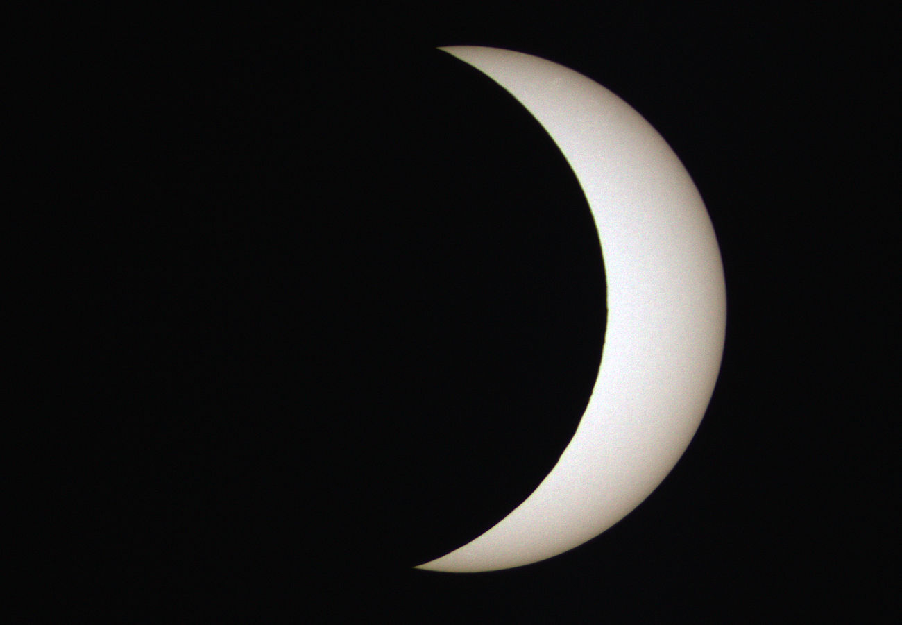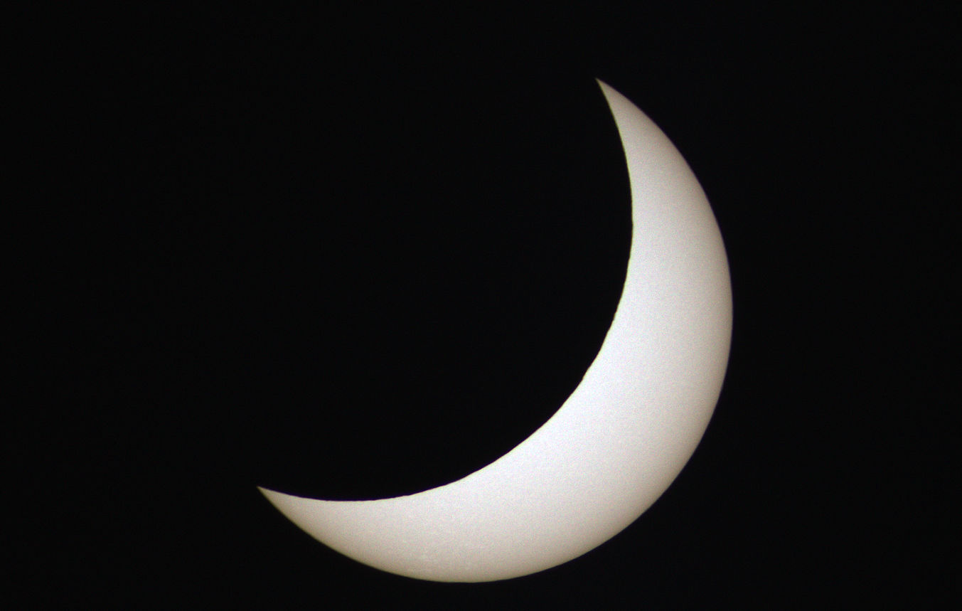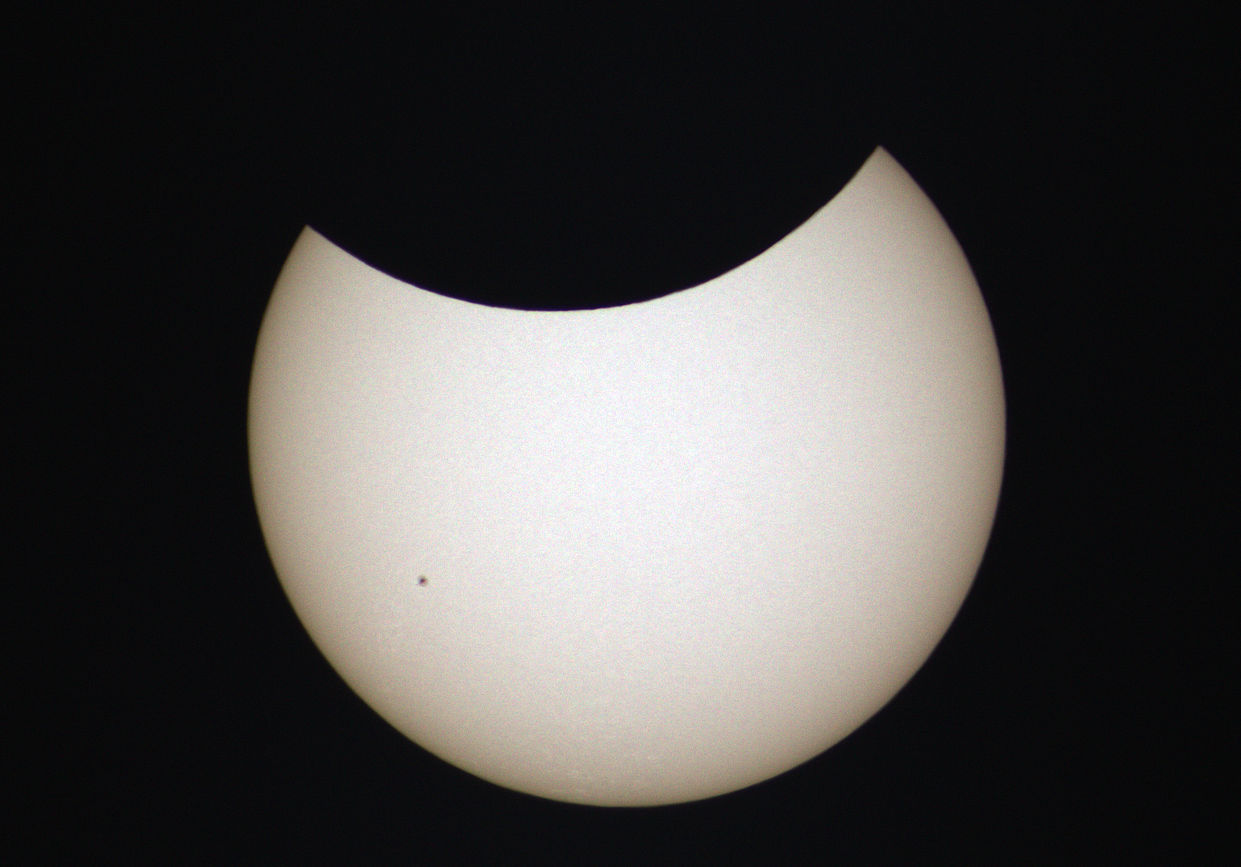 Zum ersten Mal gelang es mir, eine Sonnenfinsternis bei gutem Wetter aufnehmen. Keine einzige Wolke trübte das Ereignis. So konnte ich jede Minute während des gesamten Verlaufs ein Foto belichten. Glücklicherweise begann ich schon 9:30 Uhr mit den Aufnahmen. Denn der erste Kontakt war bereits 2 Minuten früher zu sehen, als erwartet. 9:36 Uhr begann sich der Mond vor die Sonne zu schieben. Zum Maximum 10:48 Uhr war die Sonne zu etwa 75% verfinstert. Es war spürbar kühler, als noch vor einer Stunde und die Beleuchtung war trotz Sonnenschin ungewöhnlich dunkel. Die Finsternis endete 12:55 Uhr. Ein kleiner Sonnenfleck ist auf der Sonnenoberfläche zu erkennen.