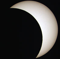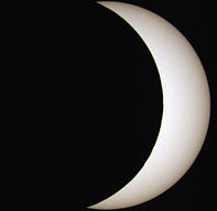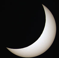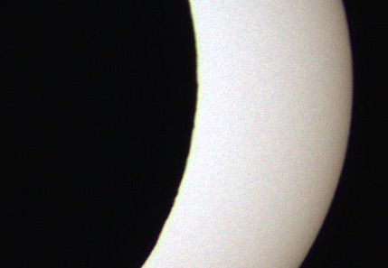 Auch bei dieser Finsternis waren am Mondrand kleine Erhebungen zu erkennen, die den Schatten von Kraterrändern und Gebirgen über der Sonnenoberfläche bilden. Um den Mondrand deutlicher sichtbar zu machen, habe ich wieder eine Animation erstellt, in der sich der Mond nicht bewegt und die Sonne sich hinter dem Mond entlang zu bewegen scheint. Allerdings wirkt sich das Seeing aus, sodass in der Zeitrafferaufnahme nur die deutlichsten Erhebungen sichtbar werden. Zum Starten der Zeitrafferaufnahme auf das Bild klicken !