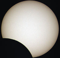 Da es mir diesmal gelang, die komplette Finsternis im Minutentakt aufzunehmen, habe ich aus allen 150 Aufnahmen eine Animation erstellt. In der Zeitrafferaufnahme ist auch ein kleiner, wild springender grauer Fleck zu sehen. Das dürfte die unscharfe Abbildung einer Verunreinigung sein. Wahrscheinlich hat sich irgendwo im Strahlengang des Teleskops ein Staubkorn abgesetzt. Zum Starten der Zeitrafferaufnahme auf das Bild klicken !
