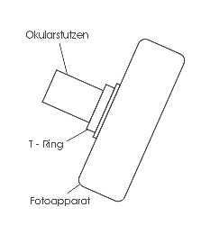 Das Fernrohr kann man wie ein Teleobjektiv mit langer Brennweite verwenden. Dazu muss man den Fotoapparat mit einem passenden Adapterring (Bild 1) direkt auf den Okularstutzen schrauben (Fotoobjektiv muss abgeschraubt werden). Bei einer Spiegelreflexkamera kann man die Bildschärfe direkt kontrollieren. Einige Kameras besitzen einen "LiveView", der das Scharfstellen erleichtert. An einer einfachen Kamera ist das Scharfstellen recht schwierig. Es gibt auch Software, die das Scharfstellen erledigt - meist in Verbindung mit einem motorisierten Okularauszug. Mond und Sonne (Sonnenfilter verwenden !) kann man ohne Nachführung fotografieren, da nur Belichtungszeiten von Sekundenbruchteilen nötig sind. Möchte man aber einige Sekunden oder gar viele Minuten belichten, ist eine Nachführung unumgänglich. Auch einfache Digitalkameras lassen sich einsetzen. Dafür gibt es inzwischen einfache Halterungen, mit denen man die Kamera hinter dem Okular befestigen kann. Da das Fernrohr schon durch den Fotoapparat besetzt ist, muss man beim Nachführen zu anderen Mitteln greifen. Eine Methode besteht darin, ein zweites Teleskop als Leitfernrohr zu benutzen. Dieses muss auf der gleichen Montierung befestigt werden wie das Fernrohr, durch das man fotografiert. Man kann es direkt auf dem Hauptteleskop befestigen. Nun sucht man sich einen geeigneten Leitstern, der sich zumindest in der Nähe des zu fotografierenden Objektes befindet. Diesen muss man durch die Nachführung wieder genau im Fadenkreuz behalten. Ist das Fadenkreuzokular nicht beleuchtet, hilft es eine Leuchtdiode mit entsprechendem Vorwiderstand und Batterie direkt vor dem Objektiv zu befestigen. Es hilft auch, den Leitstern sehr unscharf einzustellen, so dass er als heller Fleck Hinter dem Fadenkreuz erscheint. Dabei ist es einfacher seine Position im Fadenkreuz zu verfolgen. Die Vergrößerung des Leitfernrohres sollte wieder deutlich über der des Systems am Fotoapparat liegen (etwa 10 mal so hoch). Grob kann man hier abschätzen, dass ein normales Fotoobjektiv 50 mm der Vergrößerung 1 entspricht. Ein Teleskop mit 500 mm Brennweite hat dann den Vergrößerungsfaktor 10 u.s.w. Günstig ist es, wenn sich das Leitfernrohr gegenüber dem Hauptfernrohr ein wenig anders justieren lässt. Man kann sich dann einen helleren Leitstern aussuchen, der sich nicht unbedingt im Zentrum des gesuchten Objektes befindet. Auch bei dieser Nachführung sollte man natürlich wieder auf eine einigermaßen bequeme Position achten. Um die Belichtungszeit zu verkürzen, kann man einen Film mit höherer Empfindlichkeit einsetzen. Leider ist bei hochempfindlichen Filmen oder Digitalkameras die Körnung gröber, was sich an der Auflösung und Schärfe bemerkbar macht. Hier kann die Bildaddition helfen (siehe oben). |