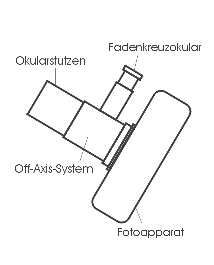 Für eine andere Methode benötigt man kein Leitfernrohr, aber ein Off-Axis-System (Bild 2). Dieses wird auf den Okularstutzen geschraubt und darauf der Fotoapparat. Durch ein kleines Prisma wird ein Teil des eingefangenen Lichtes zu einem Fadenkreuzokular umgeleitet. Das Prisma kann man bei einigen Systemen ein wenig verstellen um einen Leitstern zu finden. Das Fadenkreuzokular muss man meist extra kaufen. Dabei ist wieder darauf zu achten, dass die Vergrößerung des Systems Objektiv - Okular die des Systems Objektiv - Fotoapparat deutlich übersteigt. Die Vergrößerung berechnet man aus Objektivbrennweite dividiert durch Okularbrennweite.