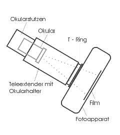 Für Fotos der Planeten, Details der Mondoberfläche oder einzelner Sonnenflecken braucht man viel stärkere Vergrößerungen. Das heißt, man müsste ein Teleskop mit mehreren Metern Brennweite verwenden. Dies ist dem Astronomie Amateur meist unmöglich. Da hilft nur ein kleiner Trick. Man verwendet das Teleskop wie einen Diaprojektor. Dabei ist der Film oder der Kamerachip des Fotoapparates die Leinwand. Benötigt wird dafür ein Teleextender. Günstig für die Einstellung der Bildschärfe ist auch hier wieder eine Spiegelreflexkamera. Oft wird heute dabei eine Astrokamera oder eine Webcam eingesetzt, die direkt am Laptop kontrolliert werden können. Der Fotoapparat wird in einem solchen System hinter dem Okular angeordnet. Das Okular projiziert das vergrößerte Bild direkt auf den Film oder Kamerachip. Je nach verwendetem Okular kann man recht hohe Vergrößerungsfaktoren erzielen. Für die Belichtungszeiten gibt es zwar Berechnungsformeln entsprechend dem Öffnungsverhältnis des Systems, aber die Helligkeit der Planeten ändert sich mit ihrer Lage gegenüber Erde und Sonne. Am Ende hilft auch hier wieder nur probieren. Mehrere Fotos mit verschiedenen Belichtungszeiten um den Idealwert sind auch dabei sinnvoll. Unerlässlich ist bei der Okularprojektion eine automatische Nachführung in der Rektaszensionsachse ( Stundenachse ). |