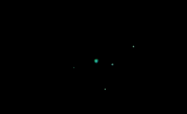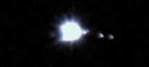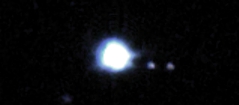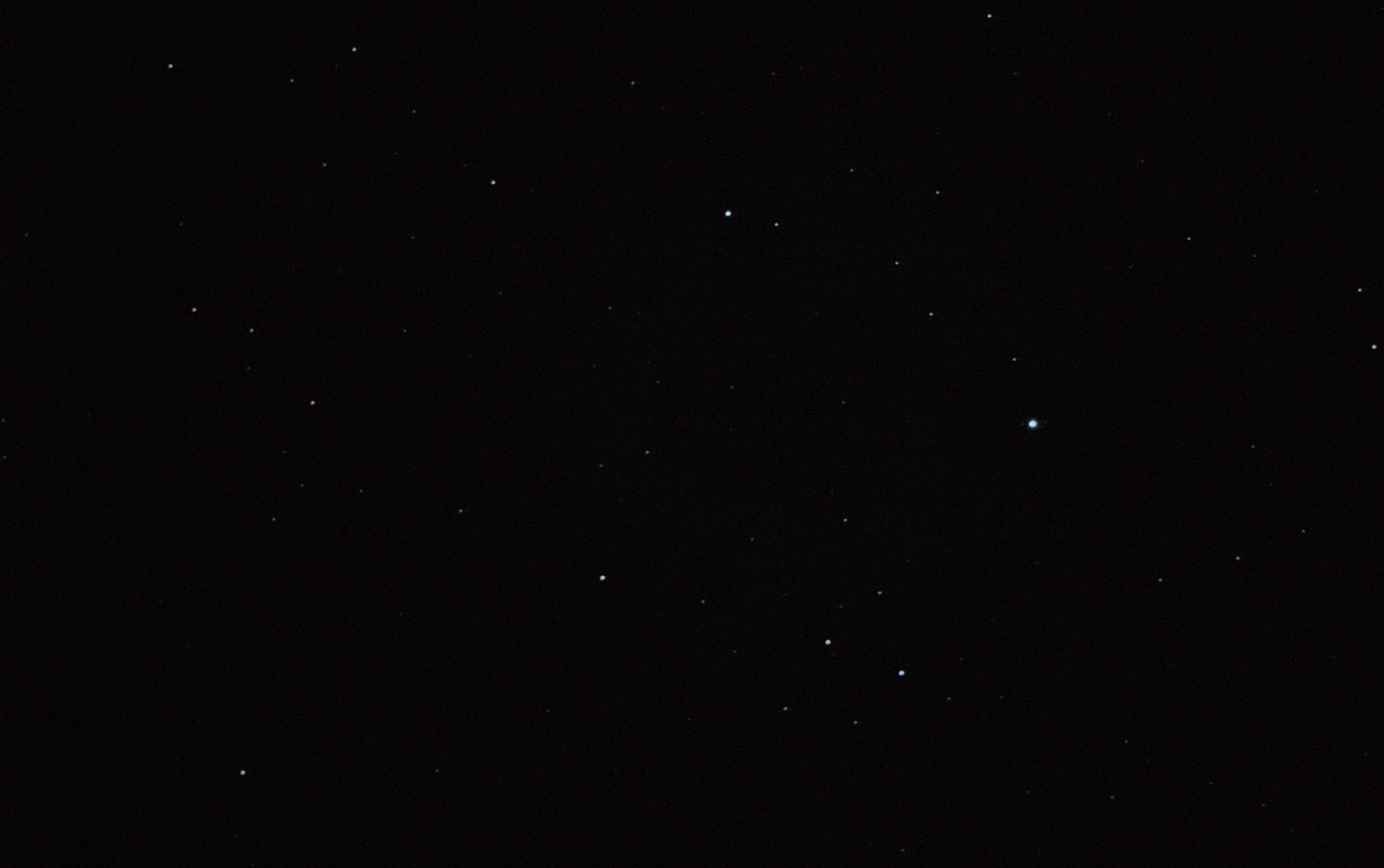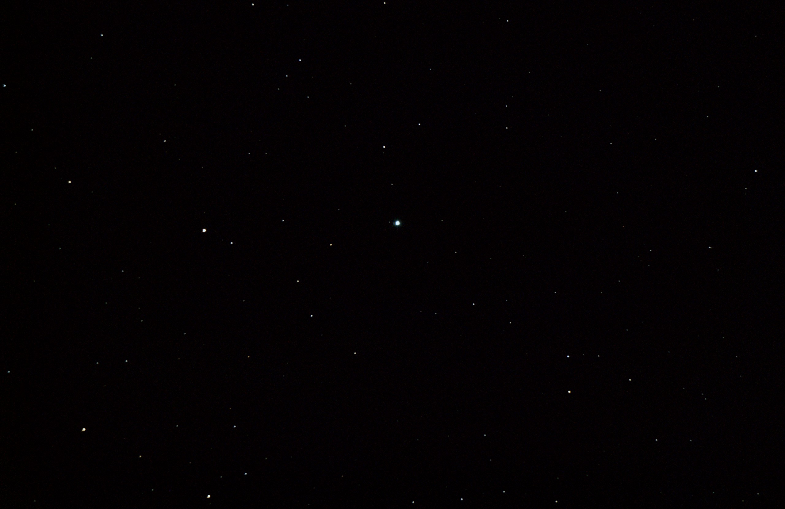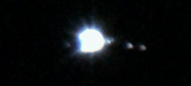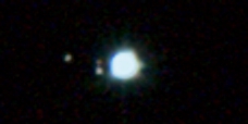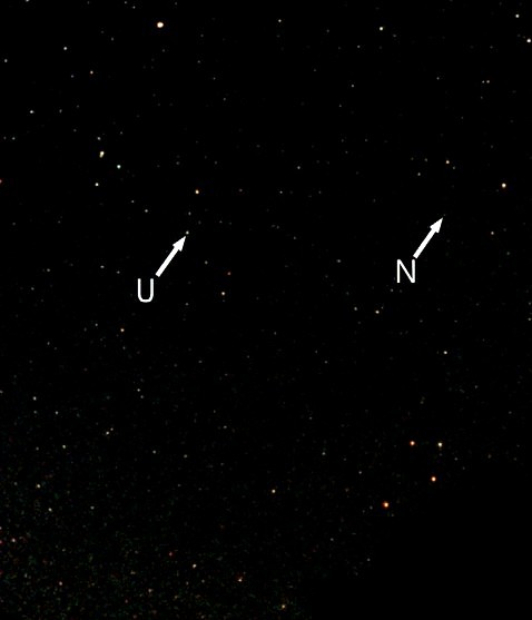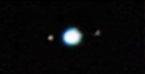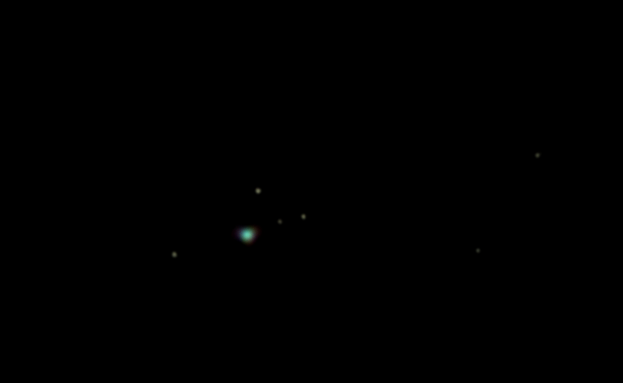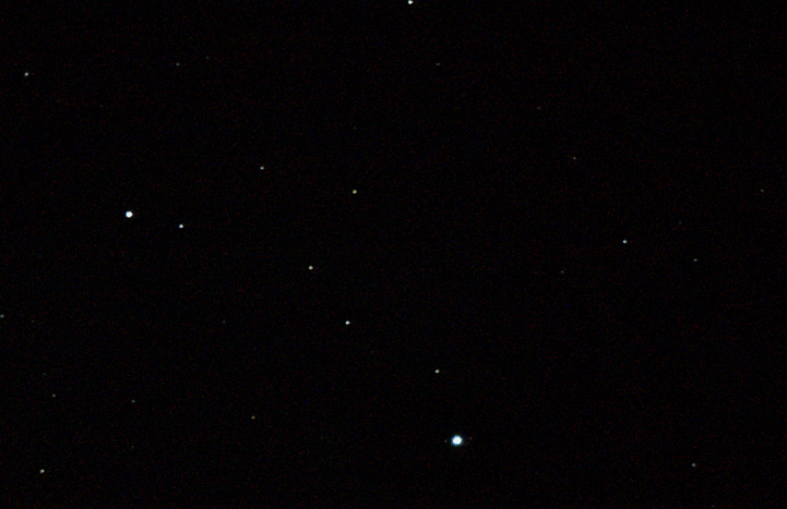 Bei längerer Belichtungszeit und mit einem größeren Bildausschnitt versuchte ich wieder die Uranusmonde aufzunehmen. Anders als bei Neptun waren diese nicht direkt auf dem Bildschirm erkennbar. Aber in der Auswertung traten sie hervor. Den stark überbelichteten Planeten habe ich durch die Aufnahme oben ersetzt. Die Monde sind: Ariel 14,3m , Umbriel 15m , Titania 13,9m und Oberon 14,1m (v.l.n.r). In der Übersichtsaufnahme sind auch noch einige Hintergrundsterne zu sehen. Der hellere Stern, unten rechts ist GSC 1237:820 mit 13,1m , links daneben ist der Stern GSC 1237:140 mit 14m zu sehen und rechts oben neben dem helleren Stern in etwa gleicher Entfernung befindet sich GSC 1237:548 mit 14,6m. Wahrscheinlich beeinflusst die aufgehellte Umgebung des Planeten auch die scheinbare Helligkeit der Monde. Die Helligkeitswerte scheinen nicht zur Aufnahme zu passen. Ariel z.B. ist deutlich zu hell.